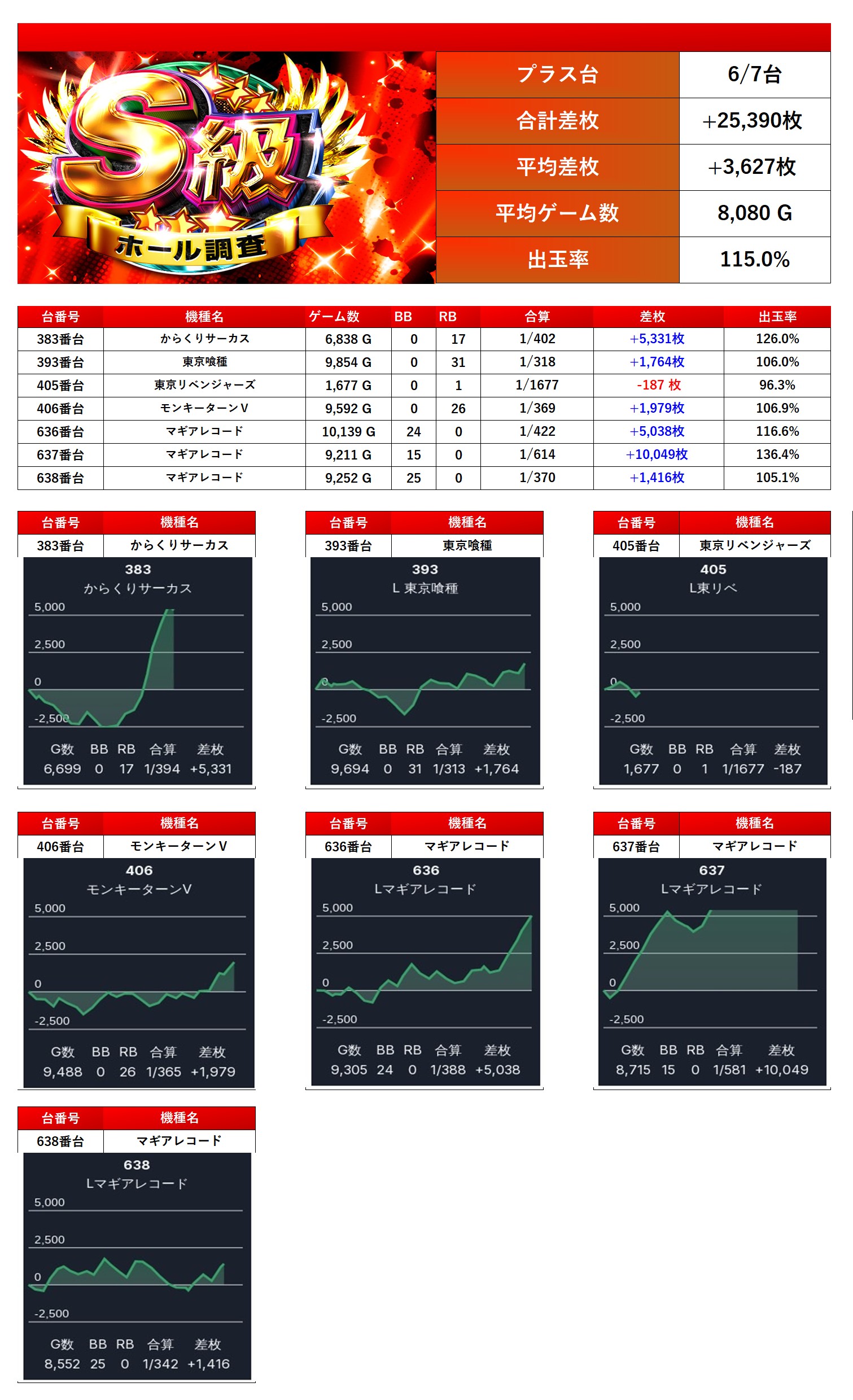 合計7台の平均差枚は +3,627枚、平均出率は 115.0% と平均ゲーム数が約8000Gと素晴らしい出率だ。