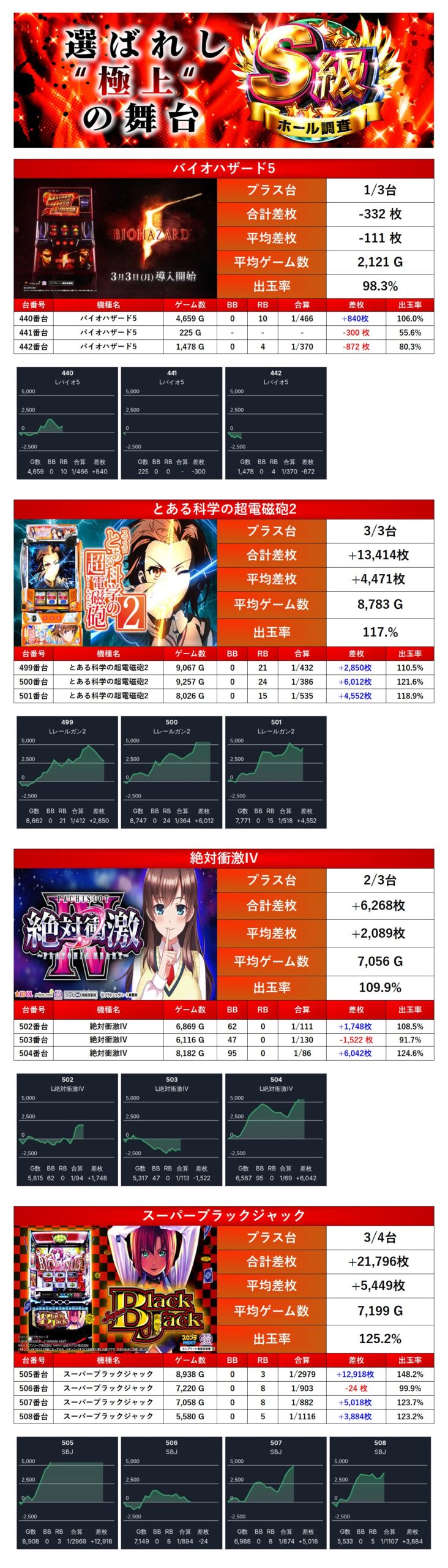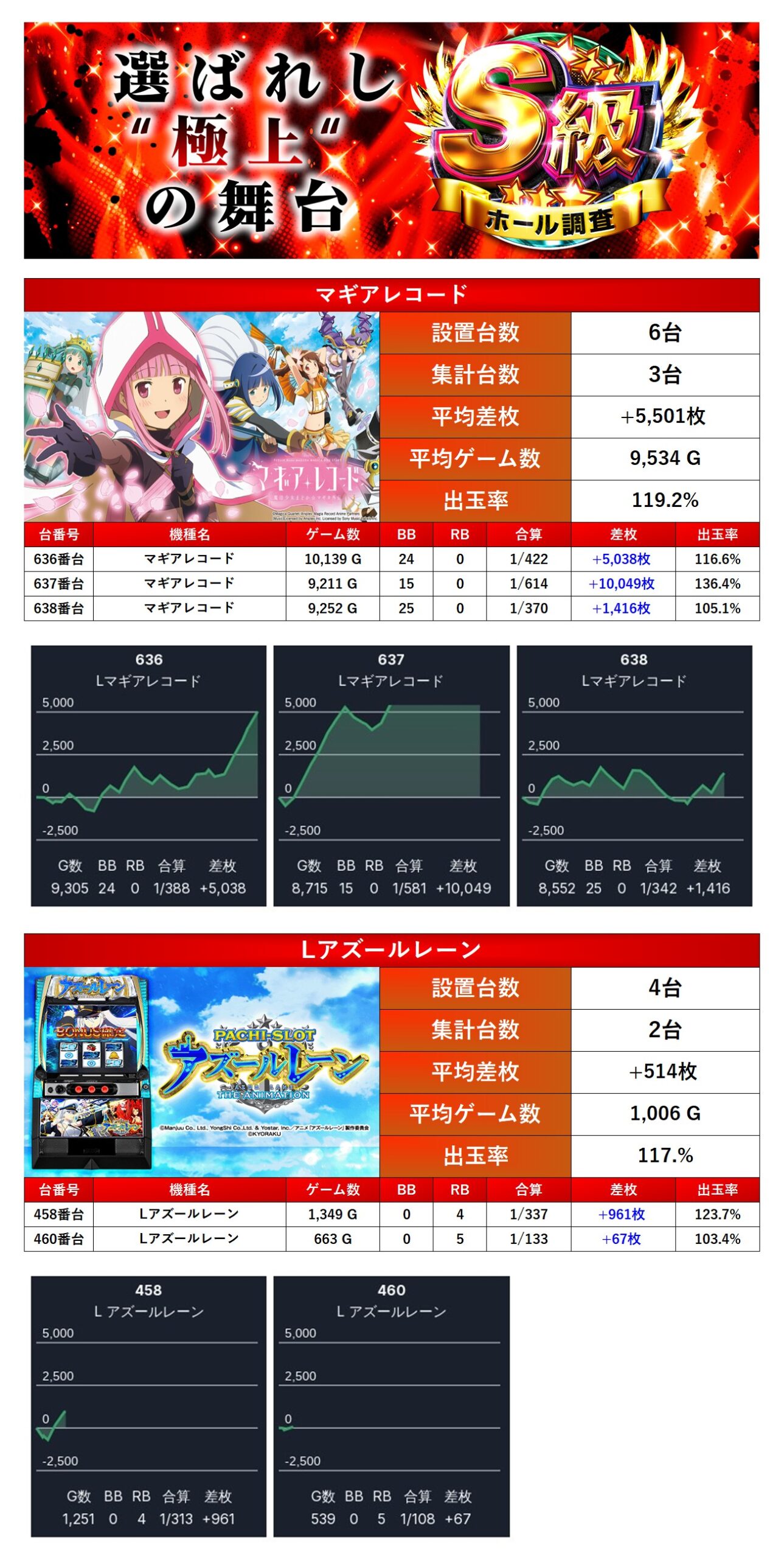 29回目となったS級調査-赤-では全台の仕掛けはpickup率は15.7%で総差枚+17,228枚/平均+59枚となり最高評価の三ツ星を獲得した。「メイン機種」を軸に「全台が好調な機種」「ニブイチ」「法則に捉われない台」とどれも質が高いしかけとなっていた。仕掛けのほとんどが114%を超える高水準な出率を叩き出し、人気機種の好調台が目立ち全館的に強い盛り上がりを見せ、調査としても非常に優れた結果となった。