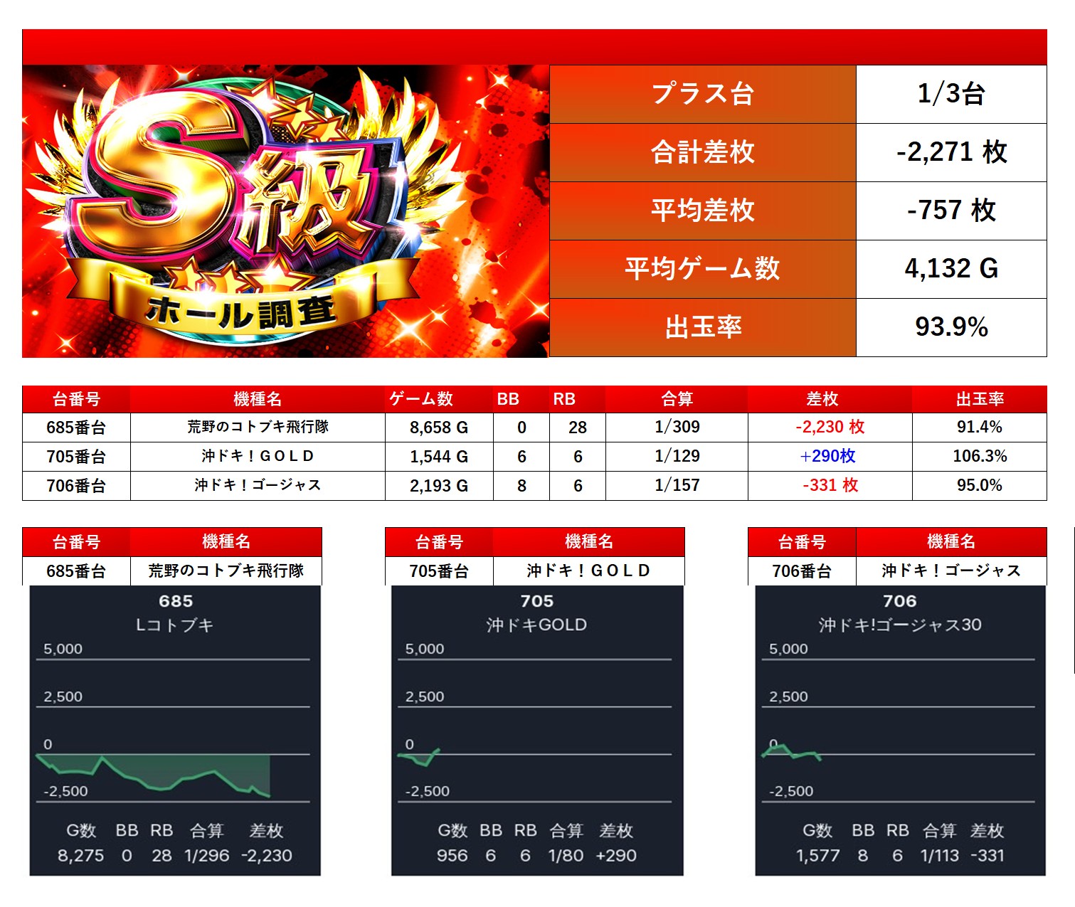 平均差枚は −757枚、平均出率は 93.9% と不完全燃焼に終わった。