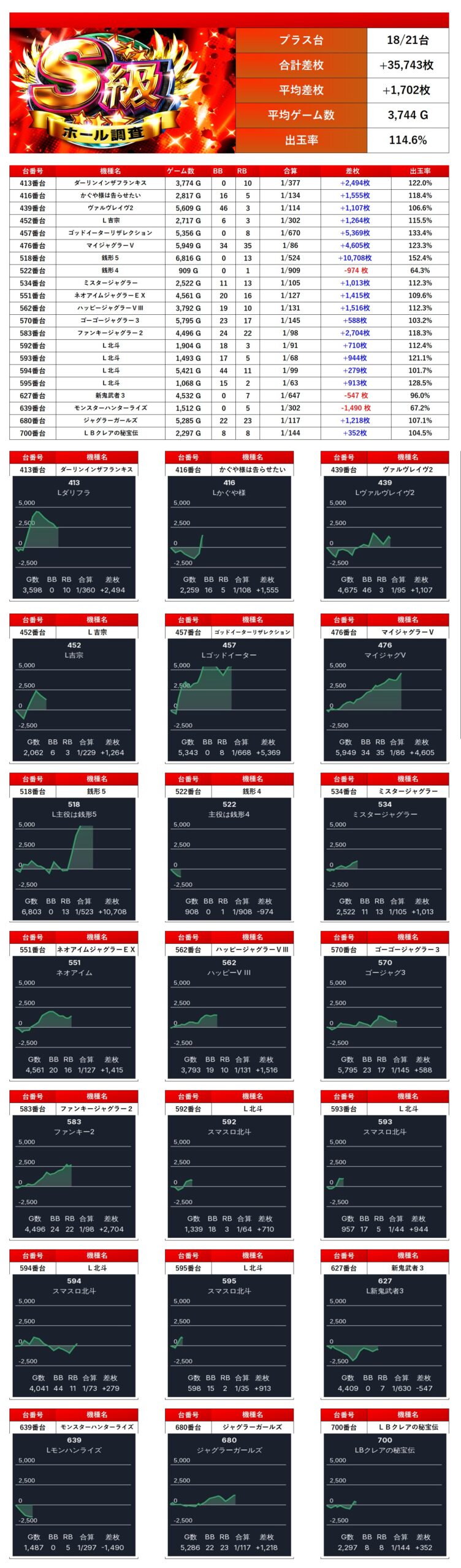全体から21台の単品をピックアップ。平均差枚は+1,702枚、平均出率は114.6%と多彩な機種が随所でpick up。18/21と勝率が高く素晴らしい。