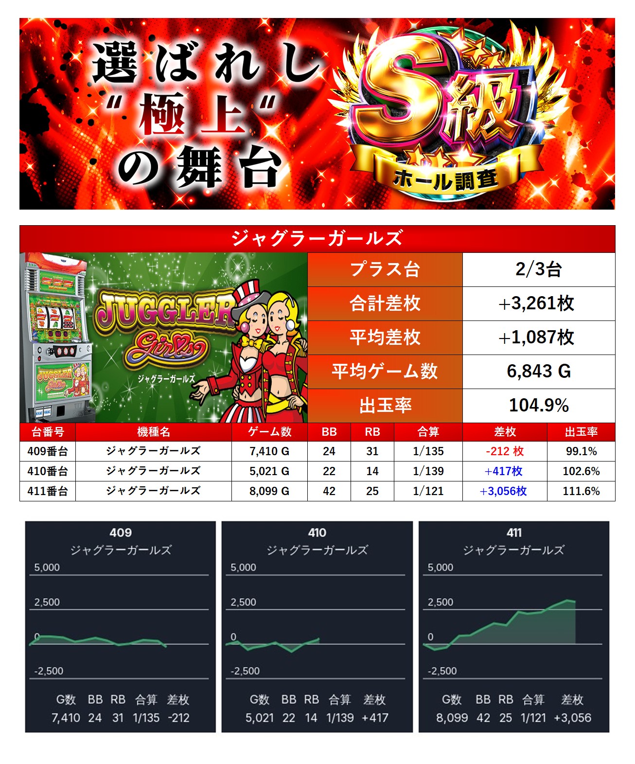 「ジャグラーガールズ」の1機種をpick upする。1機種3台の平均差枚は+1,087枚で平均出率が104.9%だった。