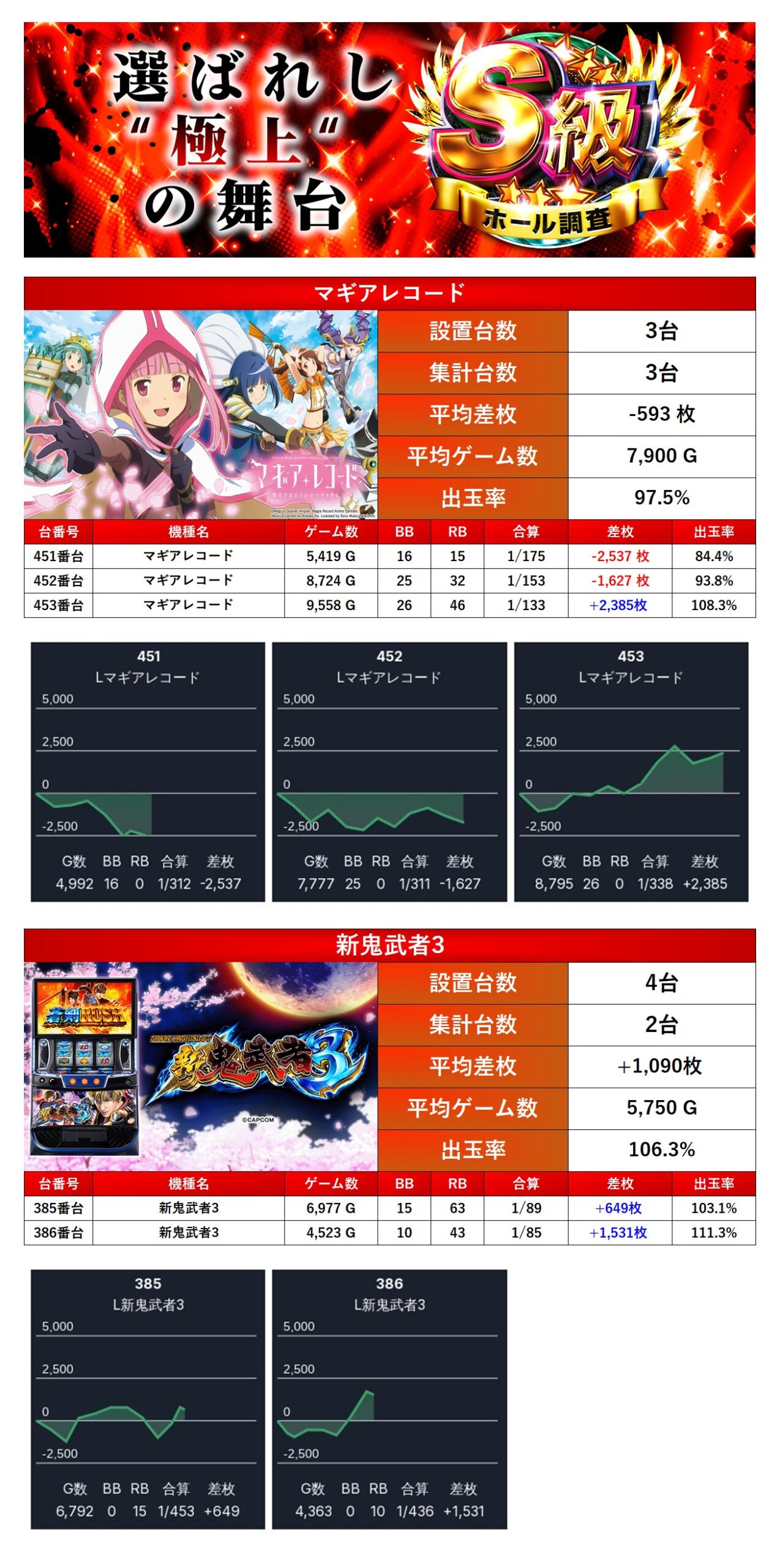 メイン機でも紹介した「マギレコ」さらに「新鬼武者3」の2機種をpick upする。2機種5台の平均差枚+80枚で平均出率が100.4%とメリハリのある結果になっていた。