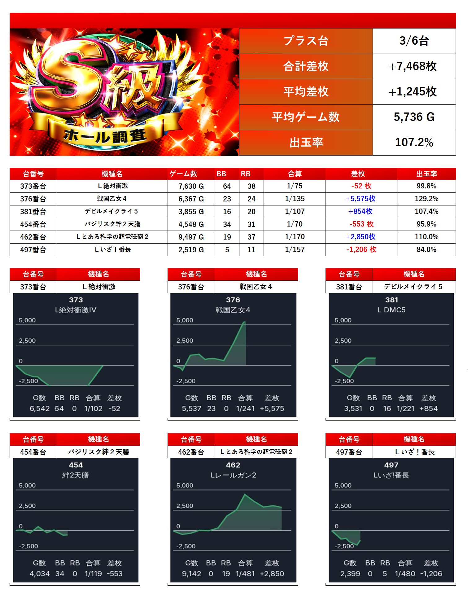 対象から6台をpick upする。6台の平均差枚は+1,245枚で平均出率が107.2%だった。