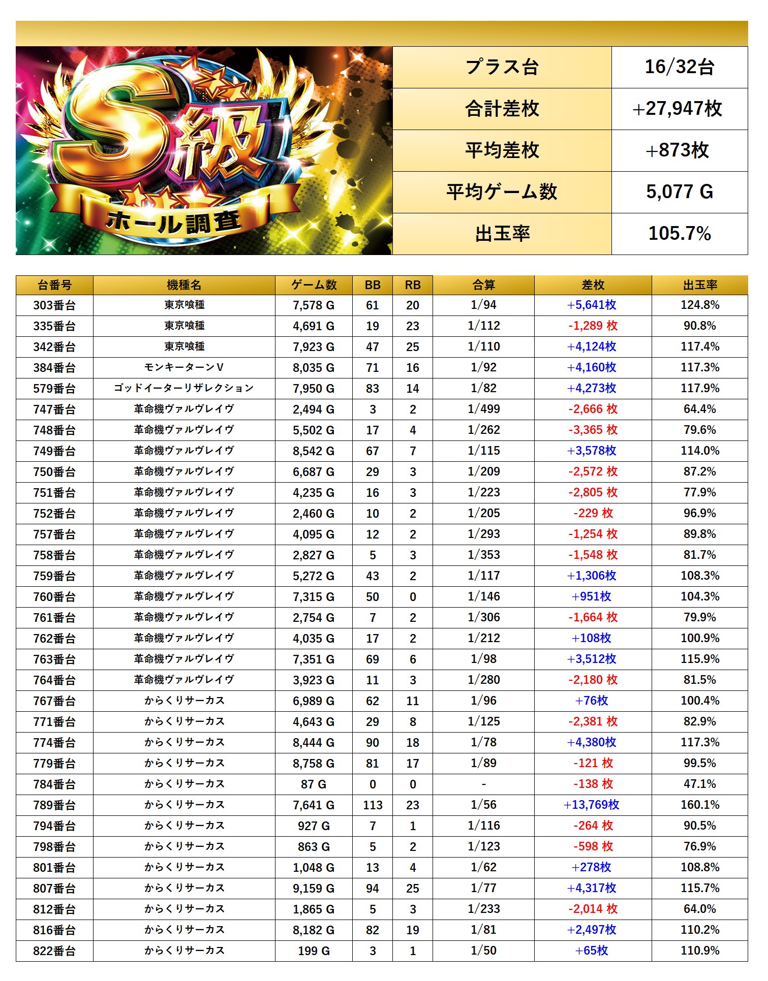 平均差枚+873枚、平均出率105.7%となった。今回は荒い台のpick upが多く数字は控えめだがしっかり打ち込まれていた。