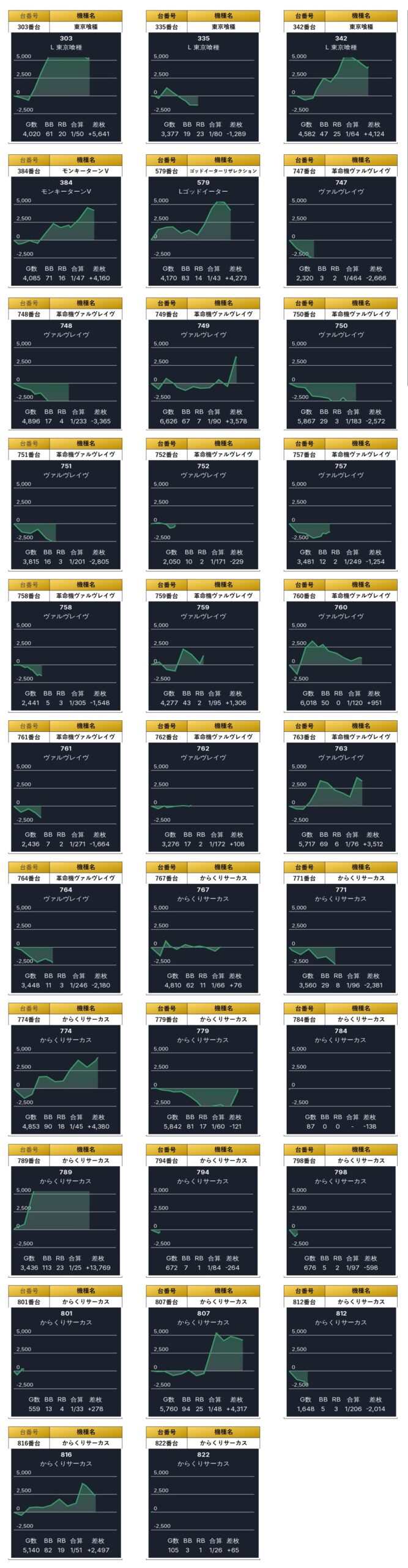 平均差枚+2,789枚、平均出率119.8%と防振りはしっかり打ち込まれ出率も119.8%と素晴らしい結果になっていた。咲-Saki-頂上決戦は前回もpick upされていたにも関わらず、今回は全台0回転と悔しい結果に終わった。