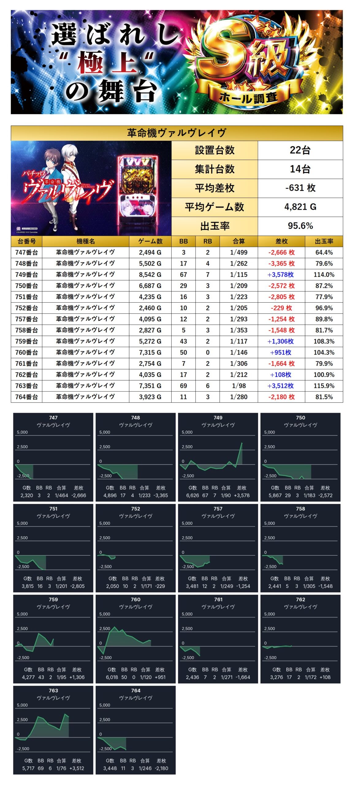 平均差枚−631枚、平均出率95.6%となった。荒いが故に悔しい結果となった。