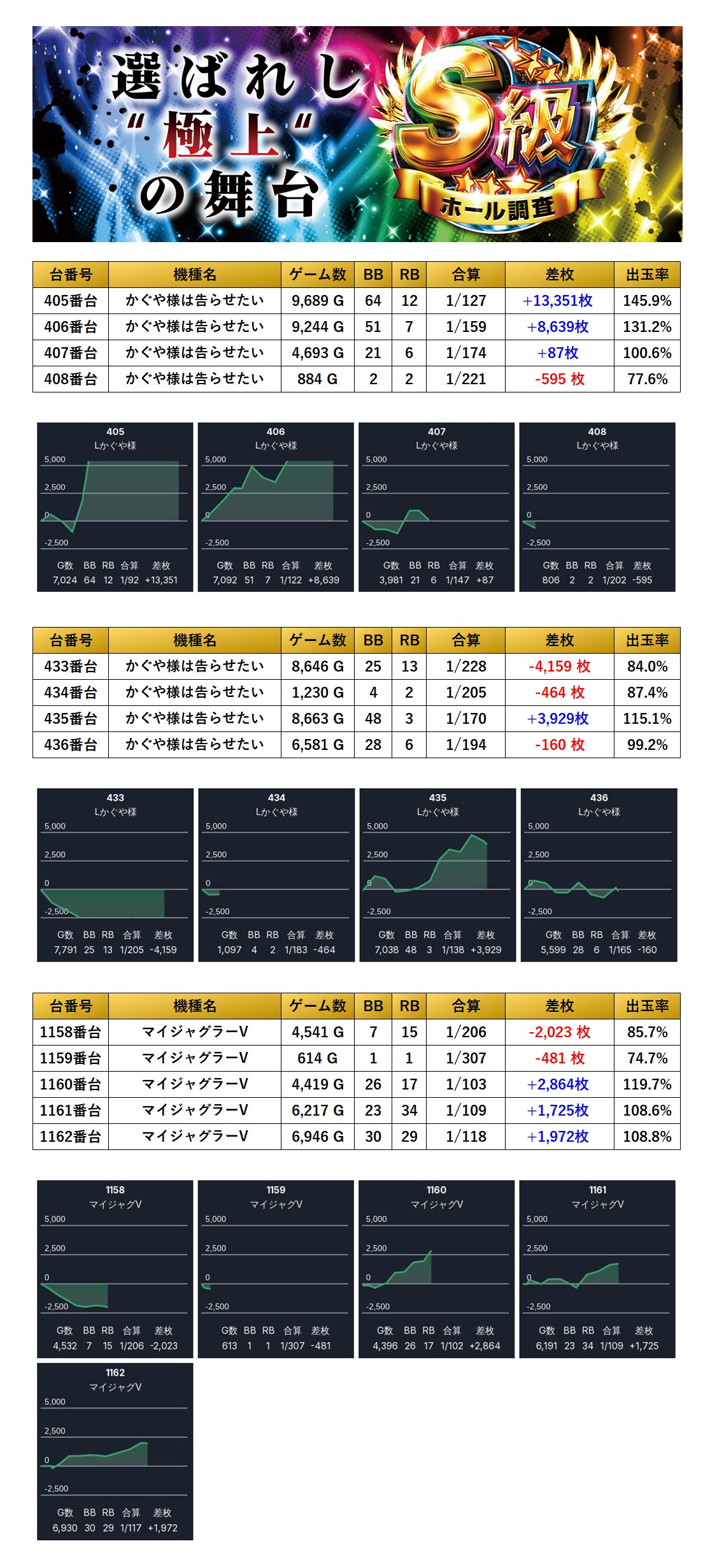 11回目となったS級‐虹‐では仕掛け量に着目してみよう。pick up率が14.6%となった。「メイン機種」からは荒い台のpick upが多い中プラス域を確保し、「全台系」では2機種pick upされ、防振りが出率119.8%と素晴らしい結果を残していた。「ニブイチ仕掛け」ではヴヴヴがpick upされメリハリがあり数字こそ付いてきてはいないが見どころがある仕掛けとなっていた。「並び仕掛け」では2機種pick upされ出玉面でも並びらしい盛り上がりがあった。「4台設置機種」では70台もpick upされている。突出した出玉は見られなかったが安定した出率を確保し、毎度の事ながら832台設置で総差枚+116,076枚、平均+140枚とメリハリはあるが、質の高さには驚かされる。今回は分岐に届かず惜しくも二つ星になり4連続三つ星獲得にはならず、次回三つ星に返り咲いてほしい。期待している。