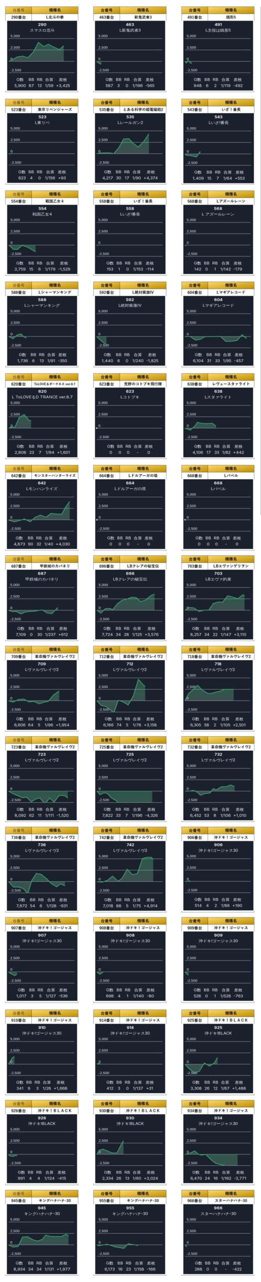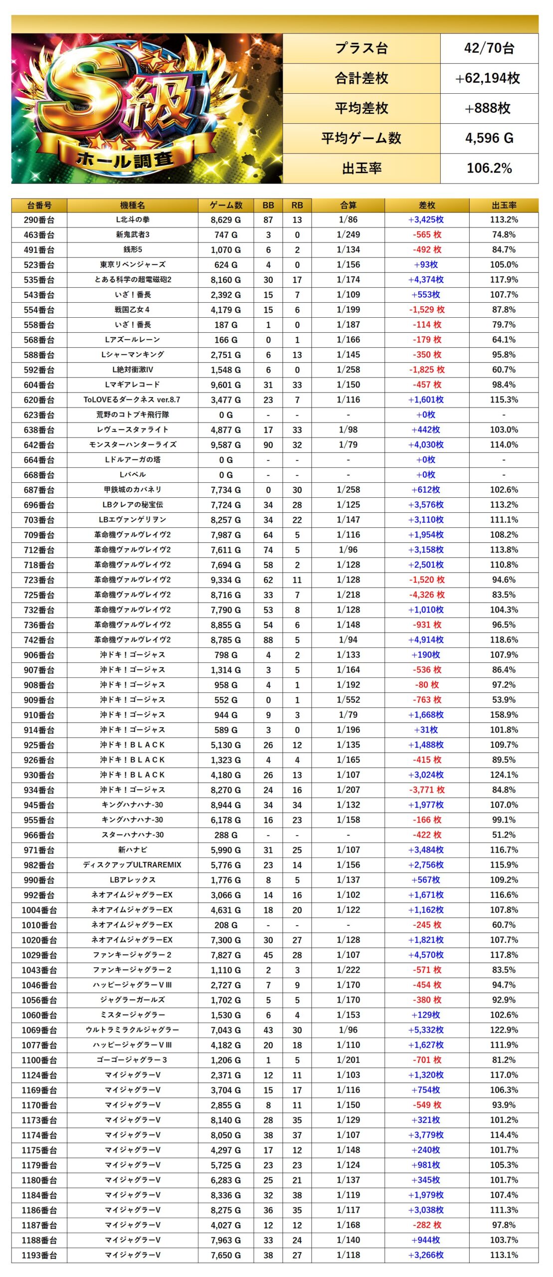 平均差枚+888枚、平均出率106.2%となった。多彩な人気のスマスロ、メダル機からpick upされ局所的な盛り上がりを見せていた。