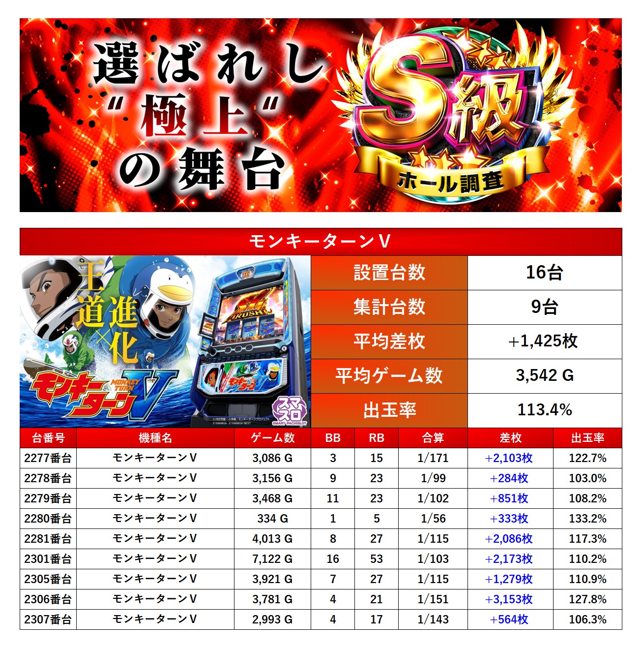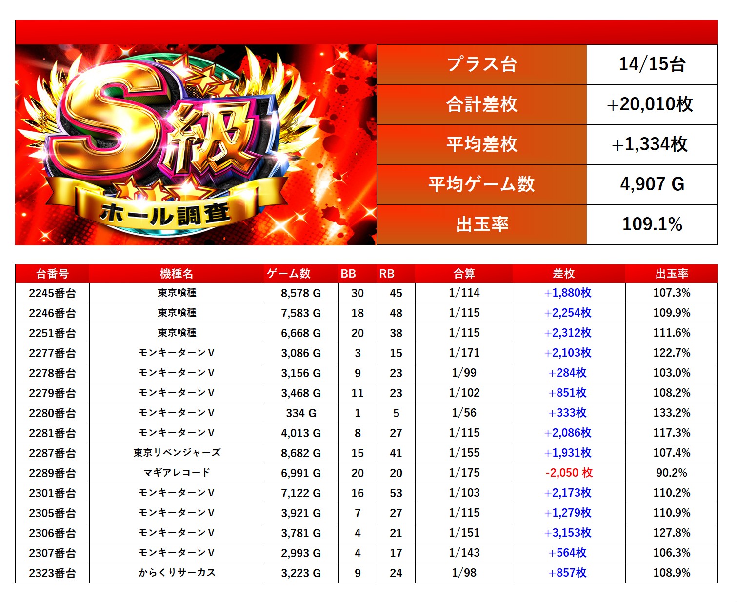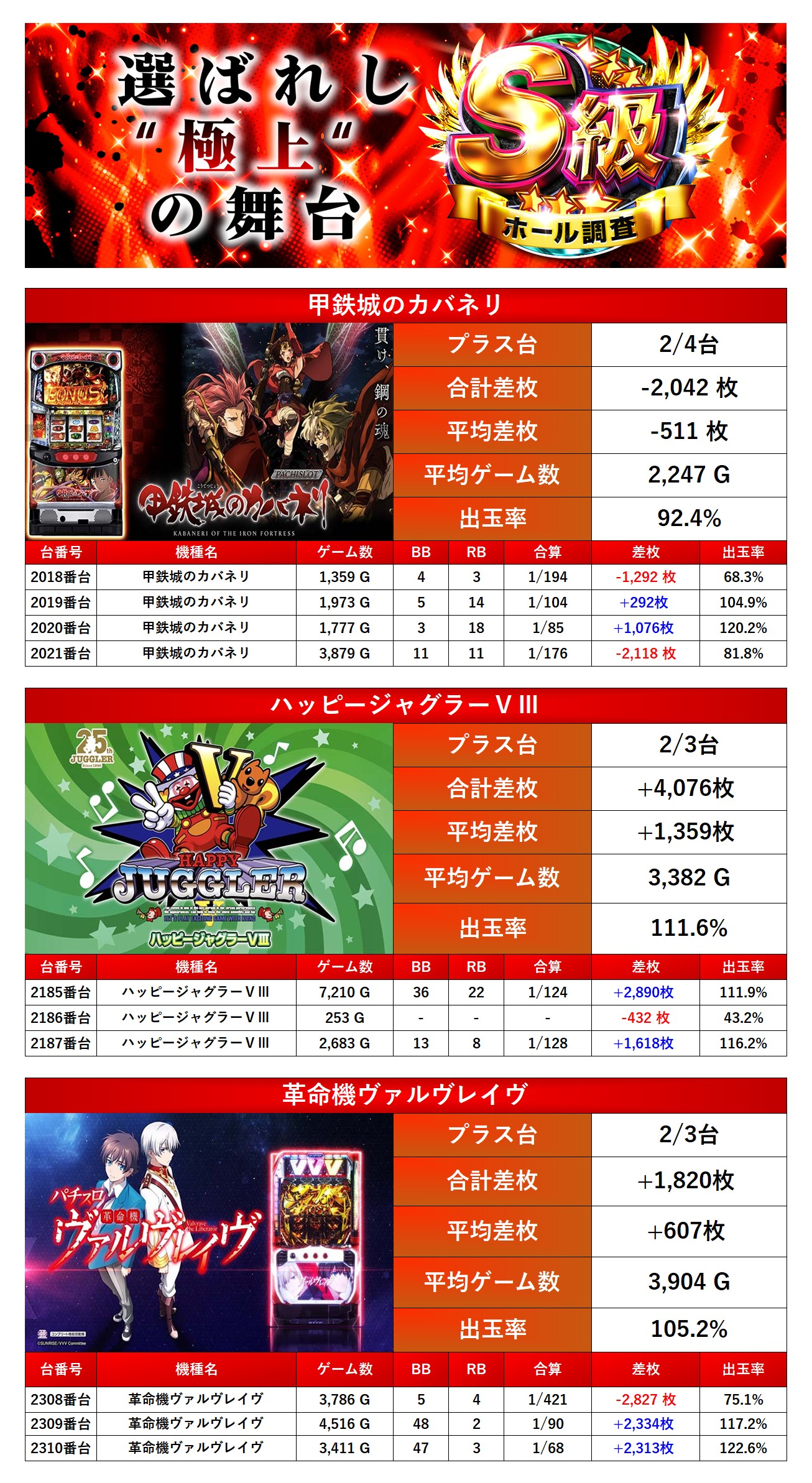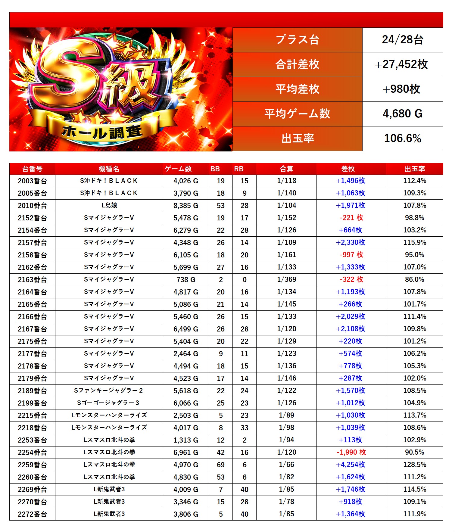 4回目の開催となるS級調査-赤-は「メイン機種」安定感のある出率を誇り、「全台が好調な機種」に加え「ニブイチ仕掛け」では仕掛けの質が高く「2台以下設置機種」ではpick upの平均出率は119%を超えている。「法則に捉われない台」からは28台pick upされた24/28がプラス域となっていた。 この強さに抽選38名/一般32名とまだまだ穴場だ。どんな戦い方でも出来る素晴らしい環境が整っている。今回は総差枚平均−281枚と展開に恵まれず数字は付いてこなかったが、pickup率24%と驚愕の数値の仕掛けが用意されていて、ポテンシャルを活かし切れず二つ星評価となった。今後の調査でも期待している。