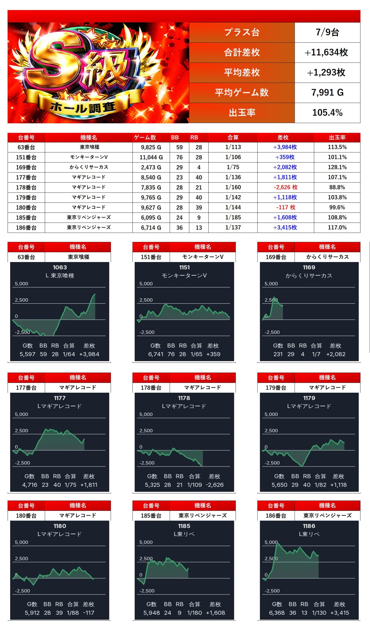平均差枚は +1,293枚/出率105.4% を記録し、安定した出玉感を演出した。