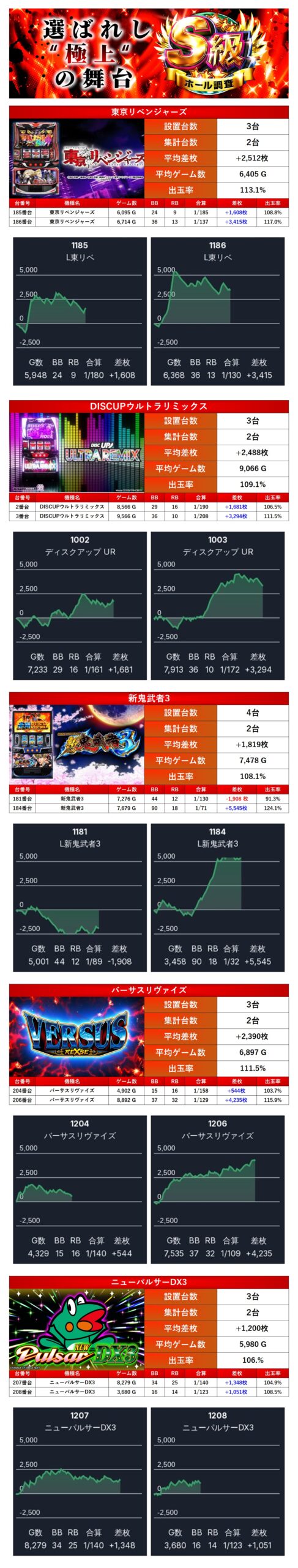 「設置の半分が優秀だった」機種としては「東京リベンジャーズ」「DISCUPウルトラリミックス」「新鬼武者3」「バーサスリヴァイス」「ニューパルサーDX3」5機種10台をピックアップ。