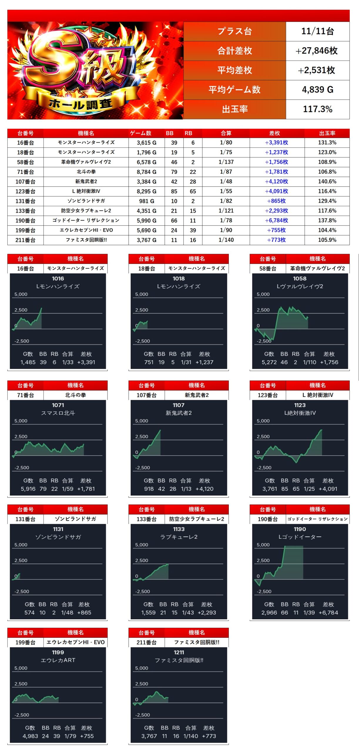 計11台が強烈な出玉を披露し、平均差枚 +2,531枚/出率117.3% と突出した存在感を放った。