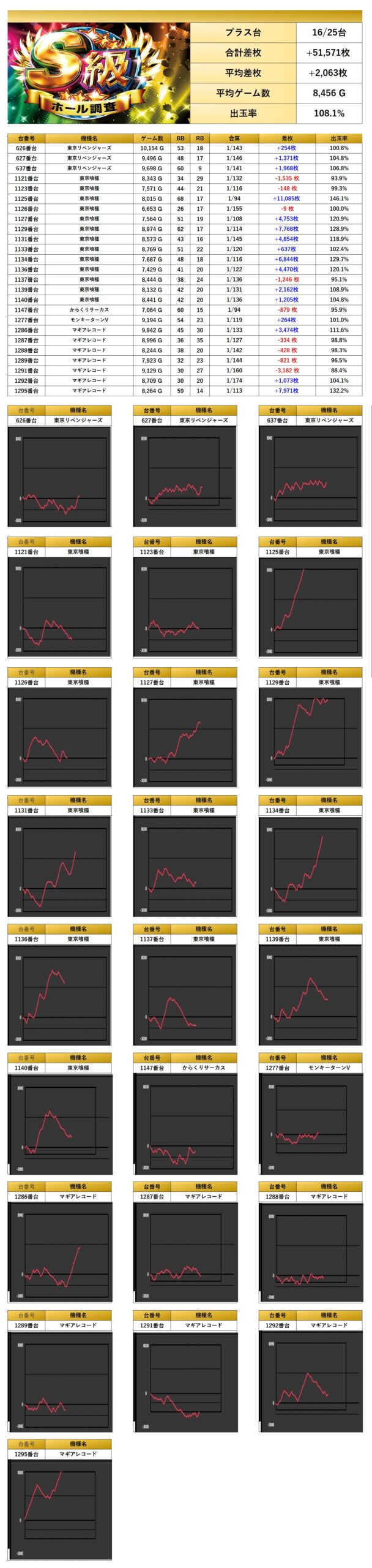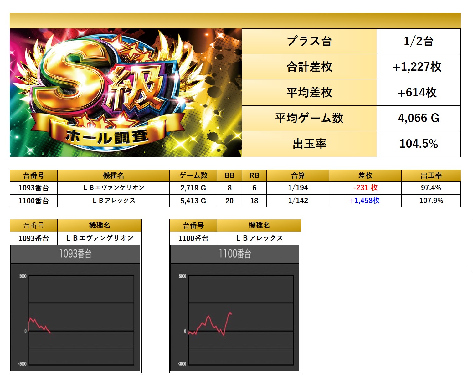全体から優秀台を探すと2台をpick upする事ができた。2台の平均差枚は+614枚で平均出率が104.5%だった。