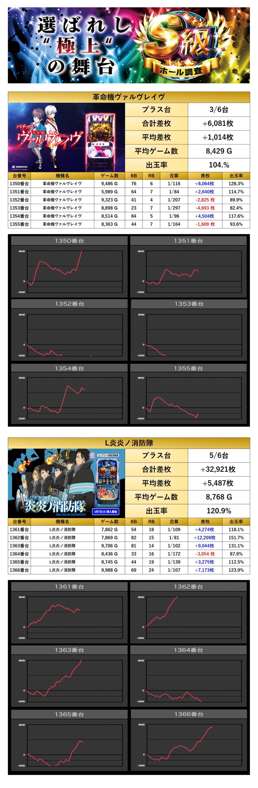 「ヴヴヴ」「炎炎ノ消防隊」の2機種をpick upする。2機種12台の平均差枚は+3,250枚で平均出率が112.6%とメイン機種に劣らず好成績を叩き出した。