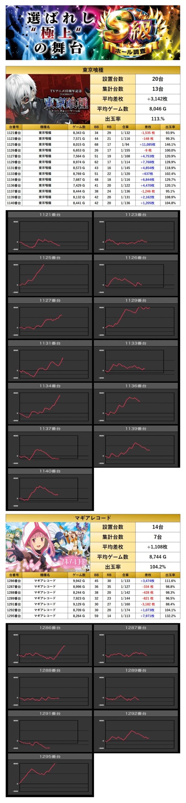 優秀台でも紹介した「東京喰種」「マギレコ」の2機種をpick upする。2機種20台の平均差枚は+2,430枚で平均出率が109.8%とどの台もしっかり打ち込まれていた。