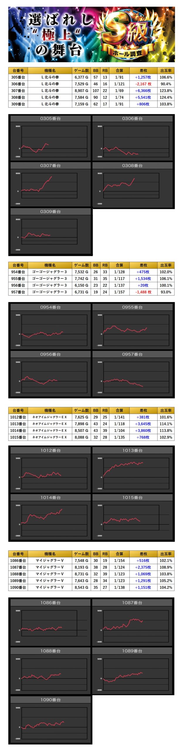 5台並びを2箇所、4台並びを2箇所の計4箇所をpick upする。平均差枚は+1,522枚で平均出率が106.3%と並びらしい盛り上がりが見れた。
