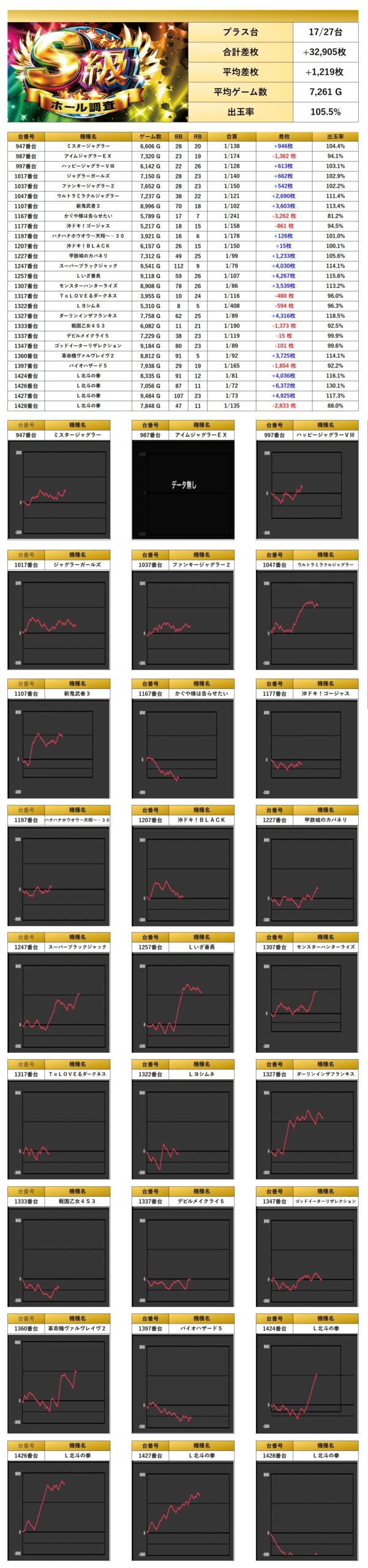 4台以上設置機種から優秀台を探すと27台をpick upする事ができた。27台の平均差枚は+1,219枚で平均出率が105.5%と多彩な機種がpick upされた。