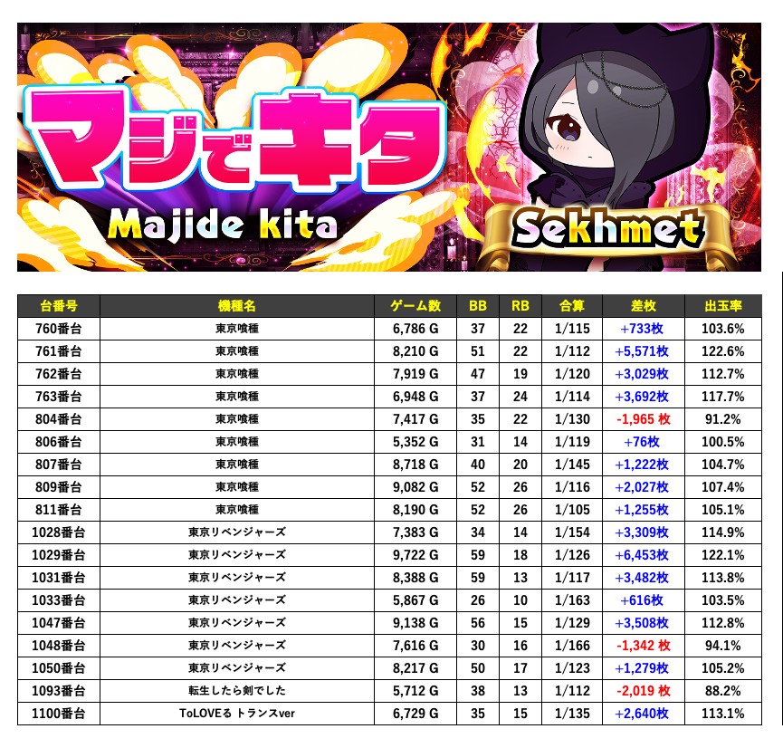 ・1台あたりの平均差枚数+1,655枚(平均出率107.7%)