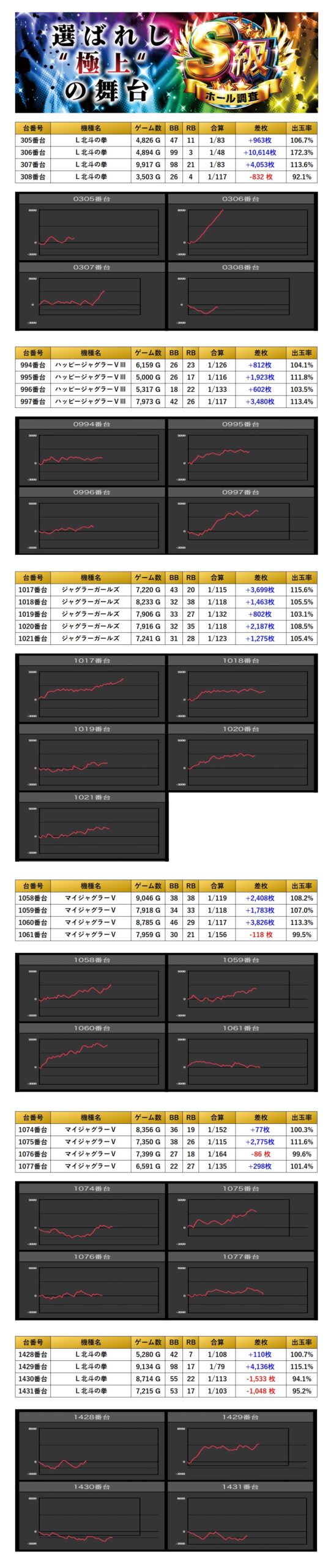 4台以上設置機種から優秀台を探すと31台をpick upする事ができた。31台の平均差枚は+777枚で平均出率が103.7%と多彩な機種がpick upされた。
