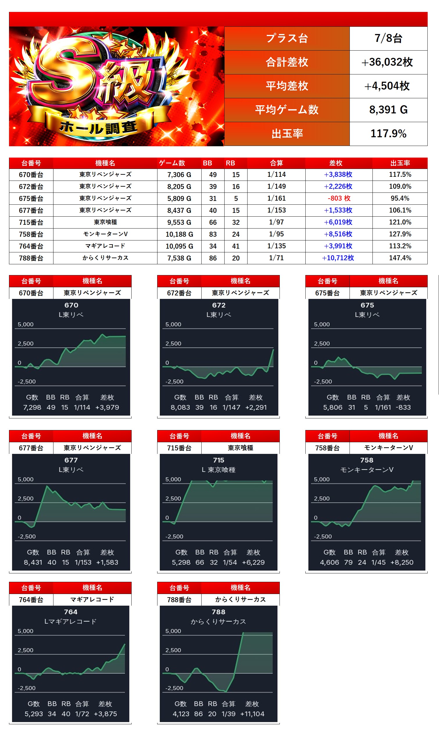 「東京リベンジャーズ」「東京喰種」「からくり」「マギレコ」「モンキー」から最優秀台を8台pick upする。平均差枚は+4,504枚で平均出率が117.9%と114.9%を超える数値となった。