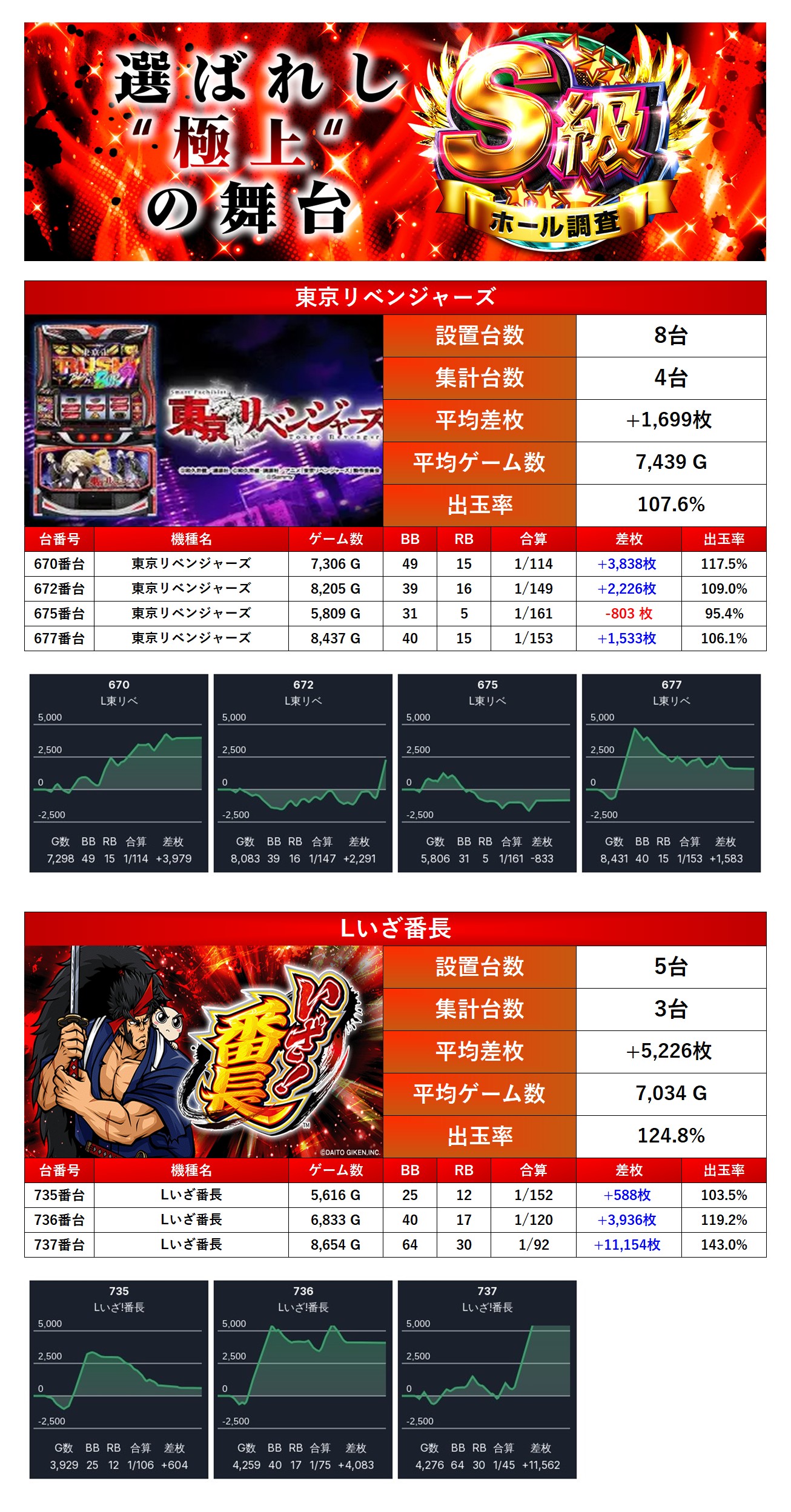 最優秀台でも紹介した「東京リベンジャーズ」、さらに「いざ!番長」の2機種をpick upする。2機種7台の平均差枚は+3,210枚で平均出率が114.7%と素晴らしい出率を誇った。