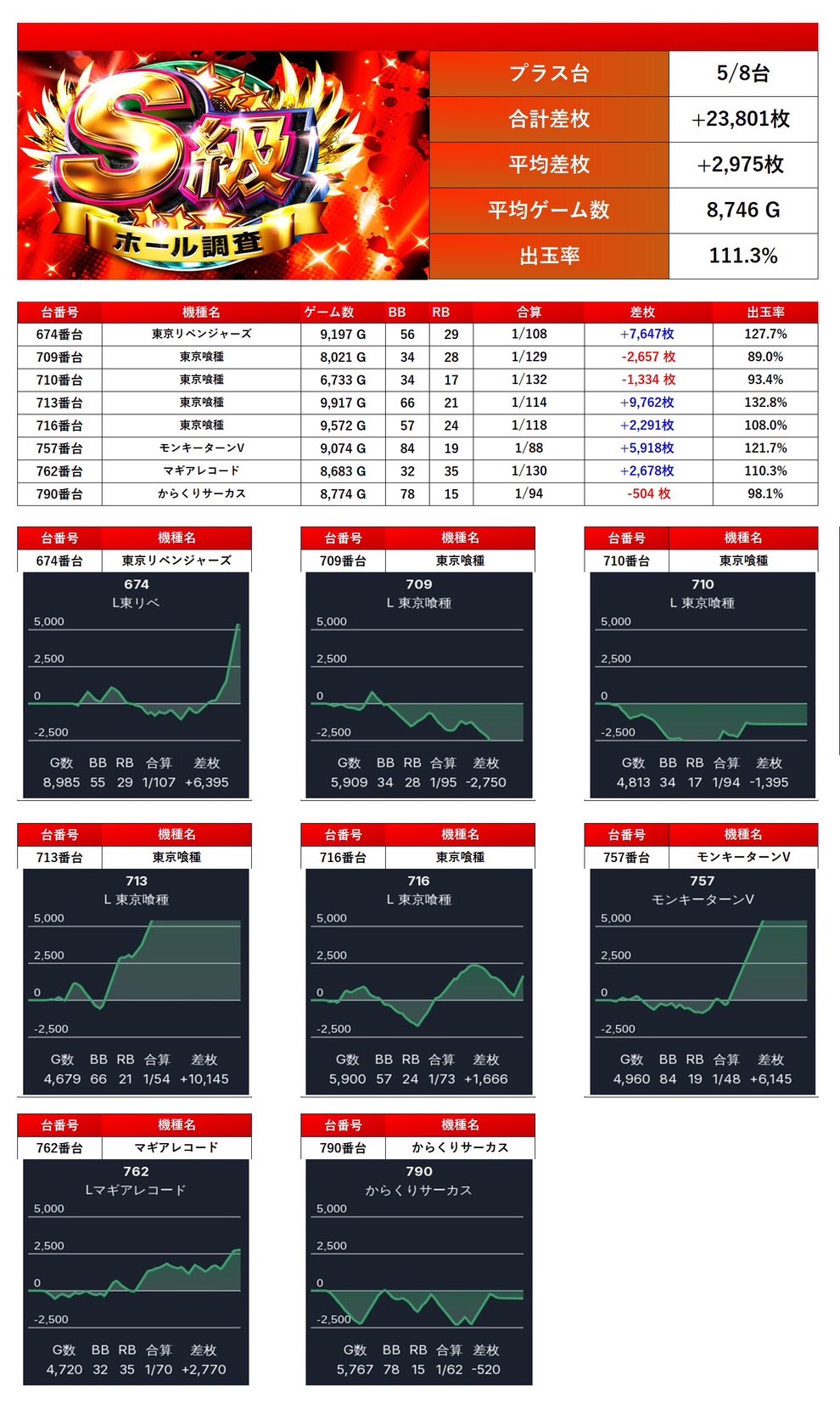 「東京リベンジャーズ」「東京喰種」「からくり」「マギレコ」「モンキー」から最優秀台を8台pick upする。平均差枚は+2,975枚で平均出率が111.3%とメイン機種らしい安定した出率だった。