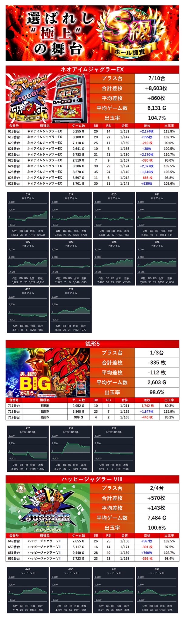 「ネオアイムジャグラー」「銭形5」「ハッピージャグラー」の3機種をpick upする。3機種17台の平均差枚は+520枚で平均出率が101.7%であった。