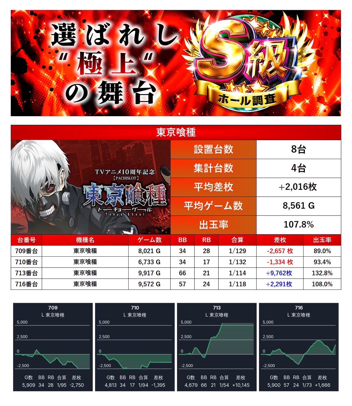 最優秀台でも紹介した「東京喰種」の1機種をpick upする。1機種4台の平均差枚は+2,016枚で平均出率が107.8%とメリハリのある仕掛けだった。