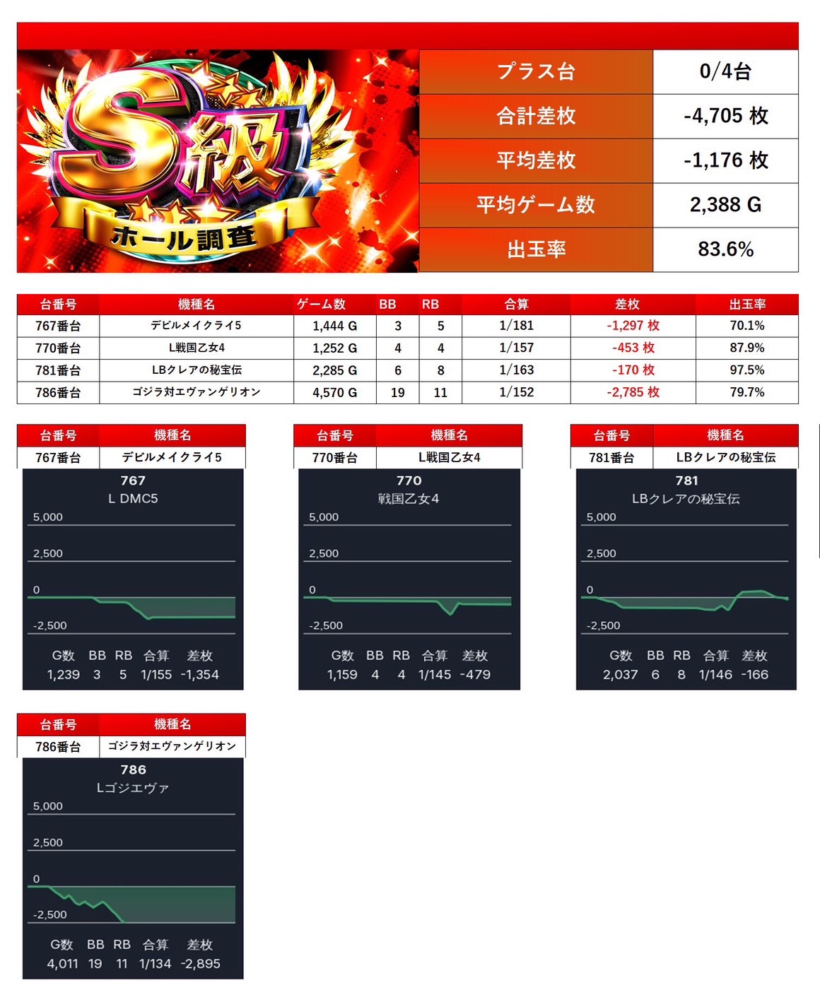 メダル機、スマスロから4台をpick up。4台の平均差枚は−1,176枚で平均出率が83.6%と打ち込みもやや足りず、ポテンシャルを発揮できずに終わった。