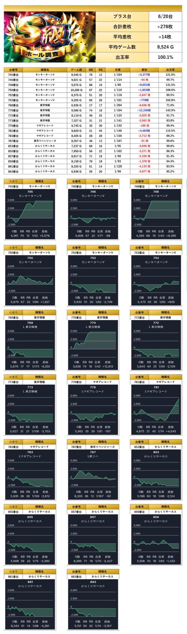ピックアップした合計20台の平均差枚は+14枚で平均出率100.1%となり局所的な盛り上がりで控えめな結果に。