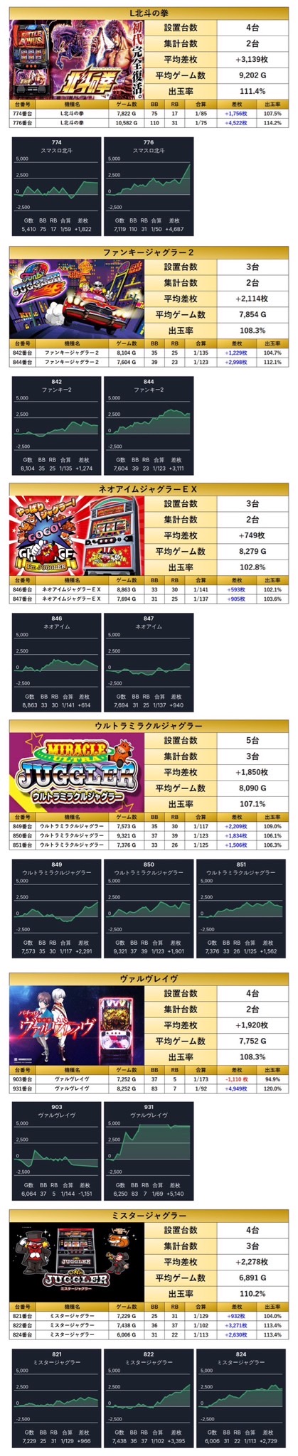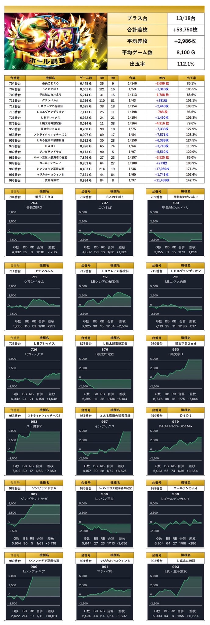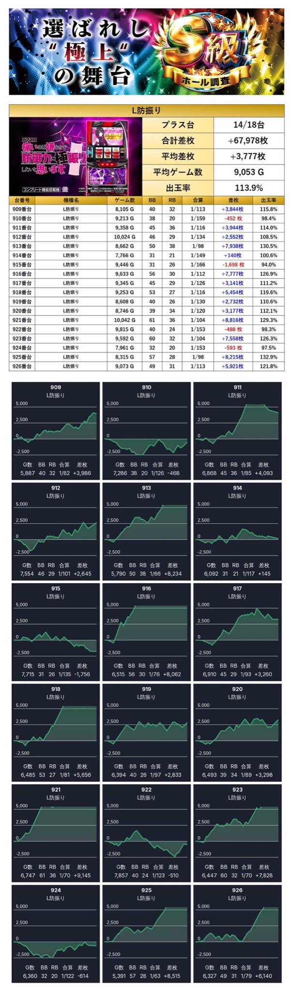 18台の平均差枚は+3,777枚で平均出率113.9%と多台数が対象になっており、圧巻の出玉でインパクトを与えた。
