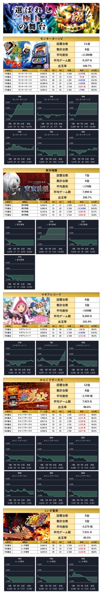 「東京喰種」「からくりサーカス」「モンキー」「マギレコ」「東京リベンジャーズ」の定番5機種から優秀台を発見!