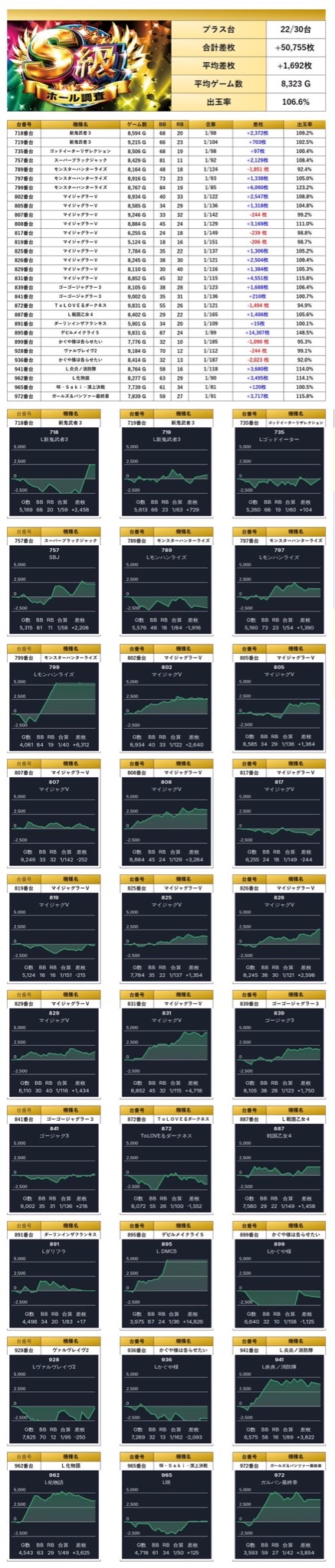 平均差枚は+1,692枚で平均出率106.6%となり、メイン機以外も幅広く狙える環境だった。
