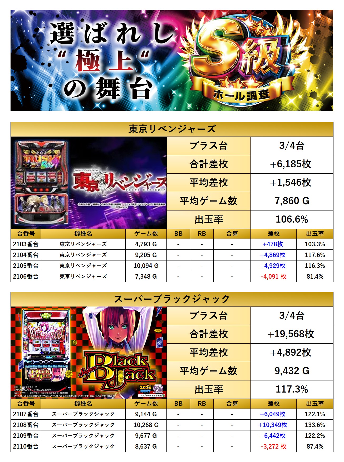 「東京リベンジャーズ」「スーパーブラックジャック」の2機種をpick upする。2機種8台の平均差枚は+3,219枚で平均出率が112.4%とホールの出率を押し上げる要因となっていた。