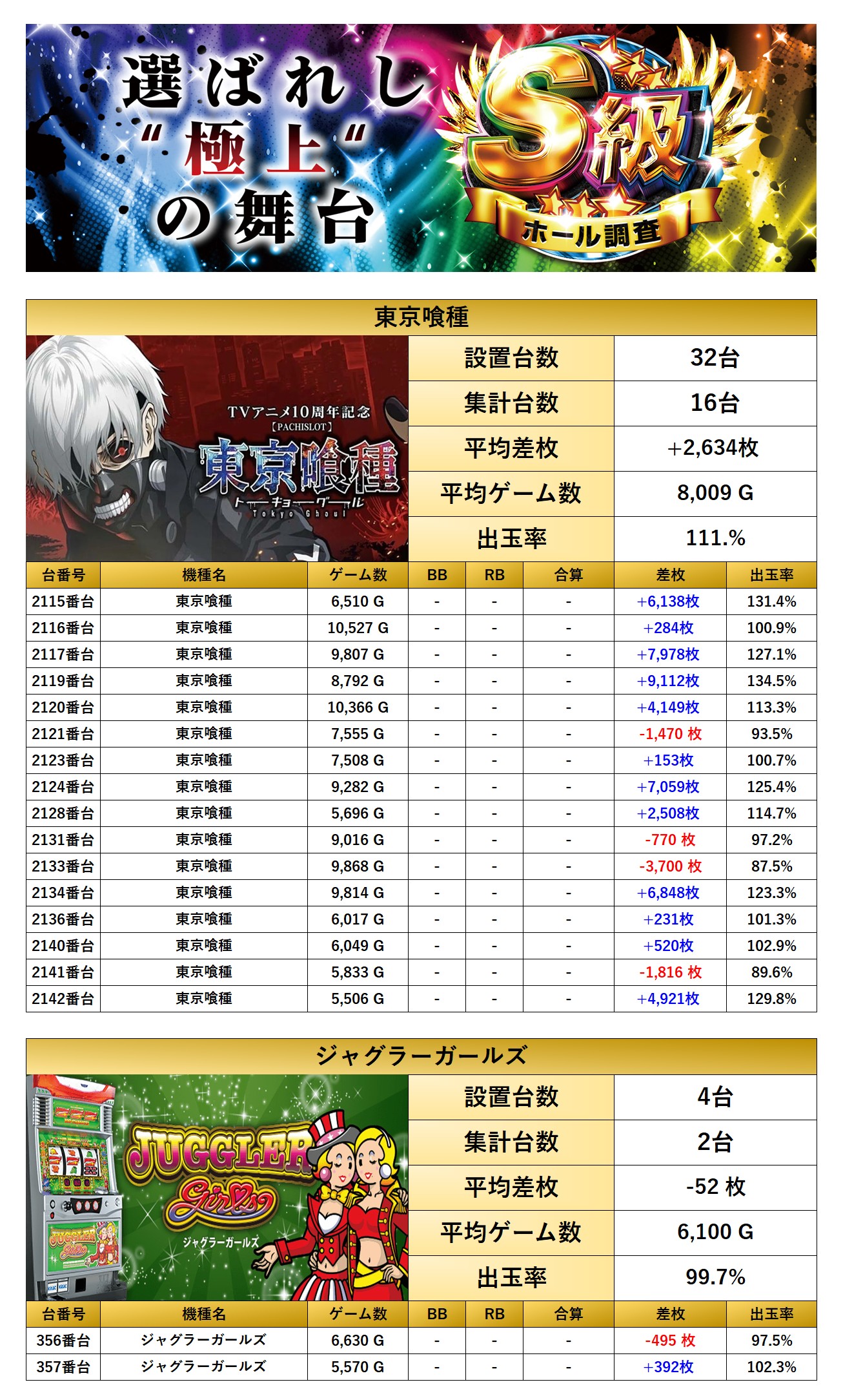 優秀台でも紹介した「東京喰種」に加えて「ジャグラーガールズ」2機種をpick upする。2機種18台の平均差枚は+2,336枚で平均出率が110.0%とどの台もしっかり打ち込まれ盛り上がっていた。