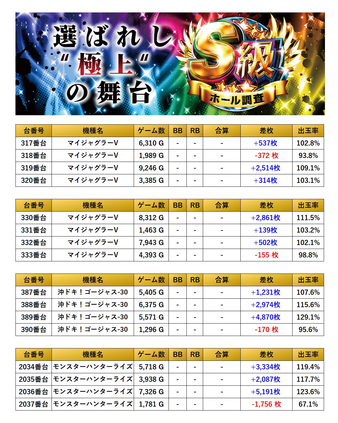4台並びを計4箇所、合計16台をpick upする。16台の平均差枚は+1,506枚で平均出率が110.0%と並びらしい盛り上がりを見せていた。