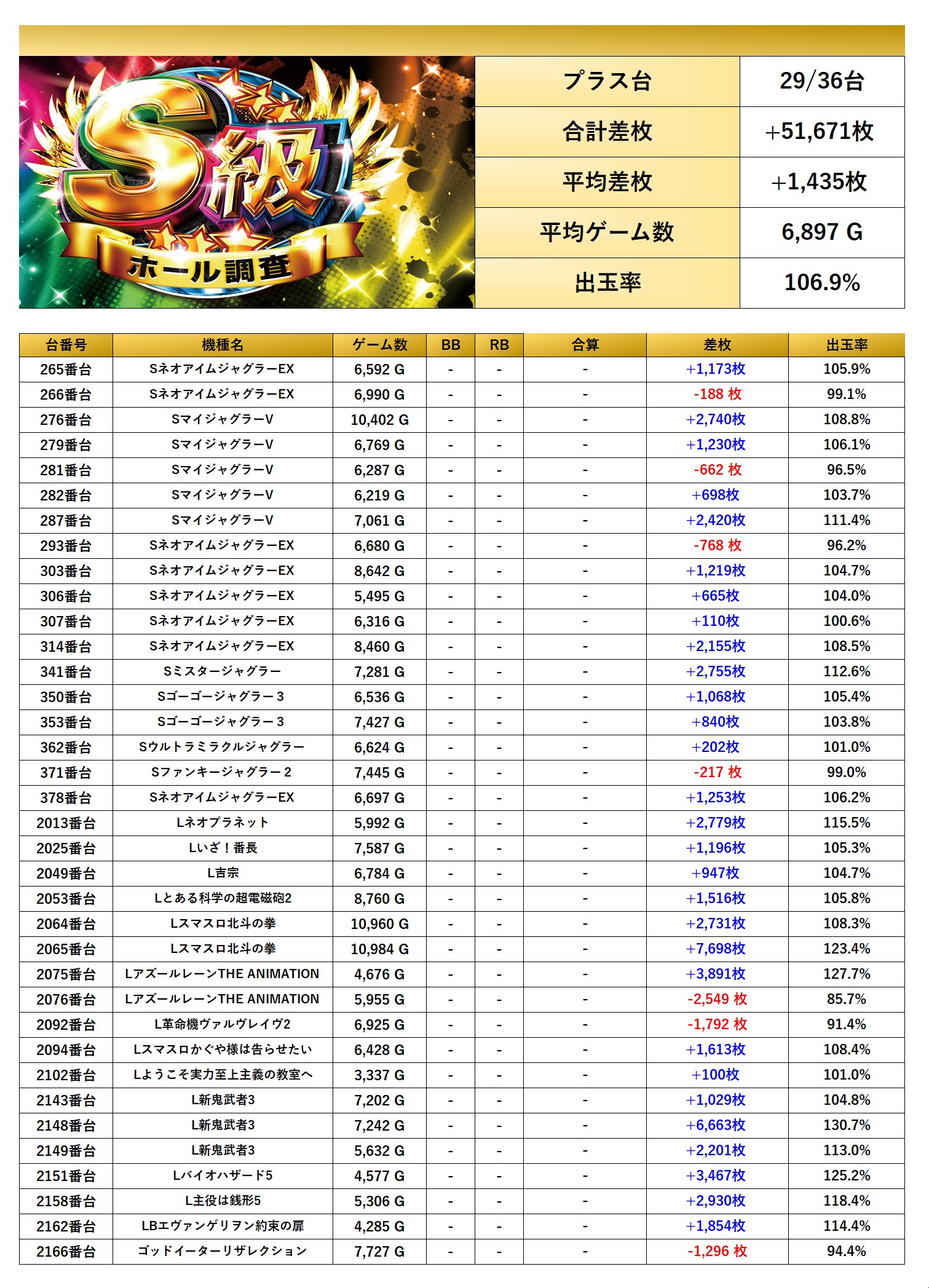 4台以上設置機種から優秀台を探すと36台をpick upする事ができた。36台の平均差枚は+1,435枚で平均出率が106.9%と多彩な機種が随所で際立っていた。