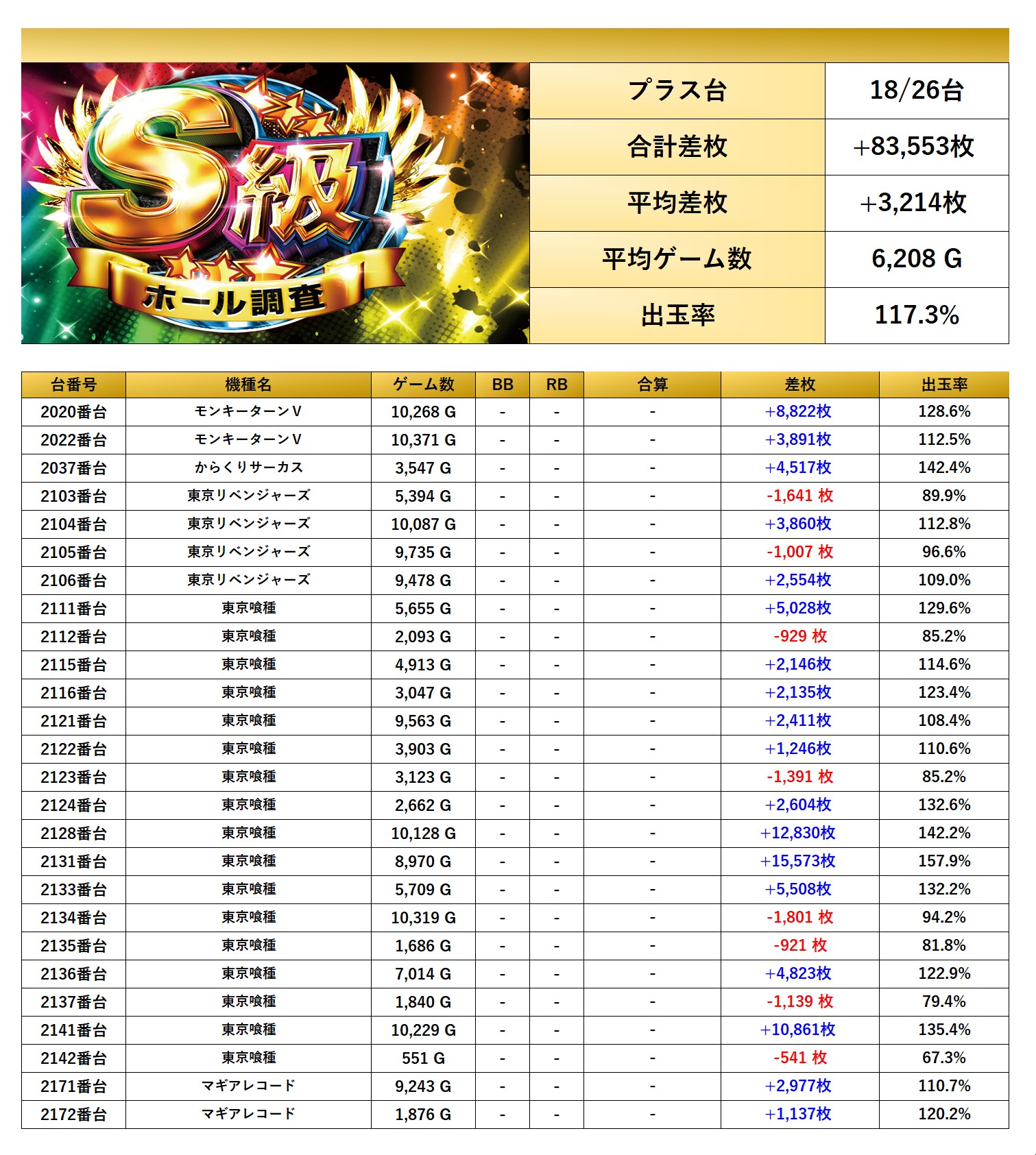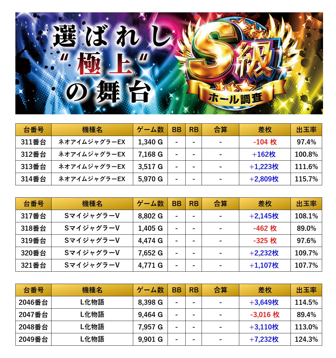 早くも3回目のとなったS級調査-虹-は全体の仕掛け率は25.6%と驚異的な数値に。これだけの仕掛け数に対して抽選58名とは選び放題の穴場だ。今回の仕掛けは個別にみると「メイン機種」を軸に「全台が好調な機種」は2機種がpick upされ、「設置の半分が好調な機種」はメインどころを2機種も絡めた仕掛けで4機種31台がpick upとなっており、「4台以上並び」は4台並びを計3箇所。新台の「化物語」もpick upされていて好評だった。「4台設置機種」は30台をpick upとなっていた。今回の総差枚は+78,445枚/平均+236枚と圧巻の好成績と言える。見事三つ星獲得が叶った。次回の調査も期待している。