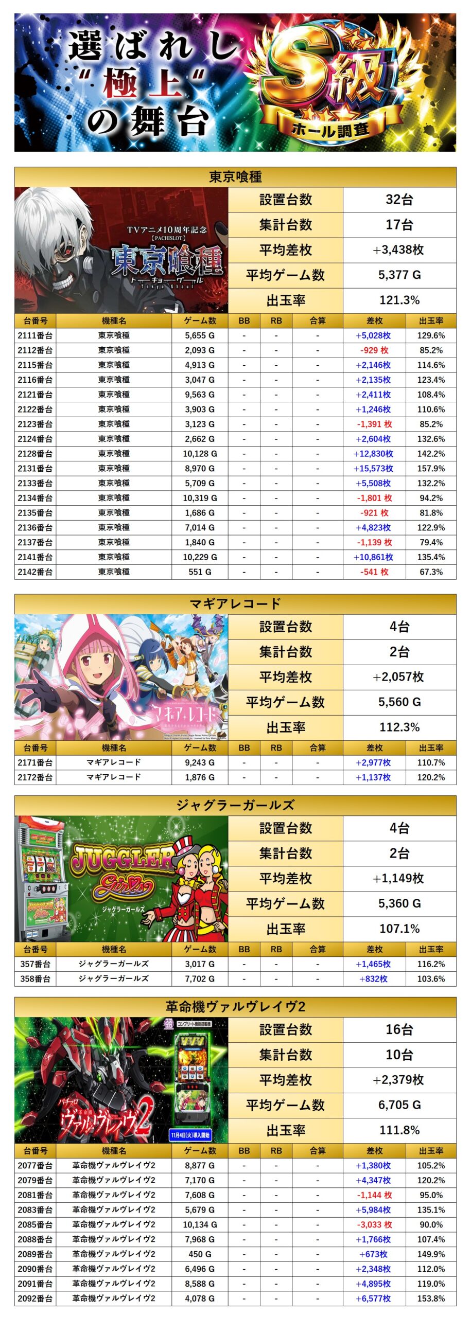 優秀台でも紹介した「東京喰種」に加えて「マギレコ」「ジャグラーガールズ」「ヴヴヴ2」の4機種をpick upする。