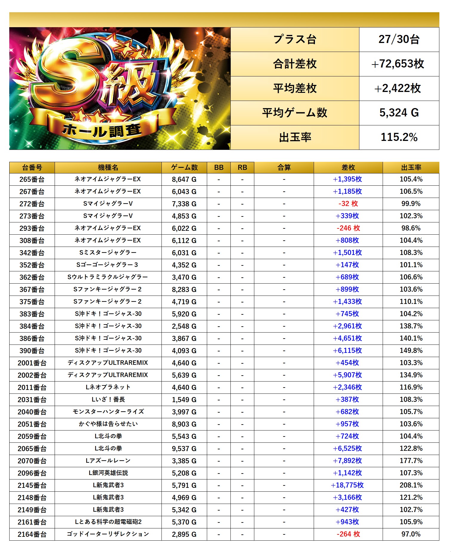 4台以上設置機種から優秀台を探すと30台をpick upする事ができた。30台の平均差枚は+2,422枚で平均出率が115.2%と多彩な機種が随所で際立っていた。