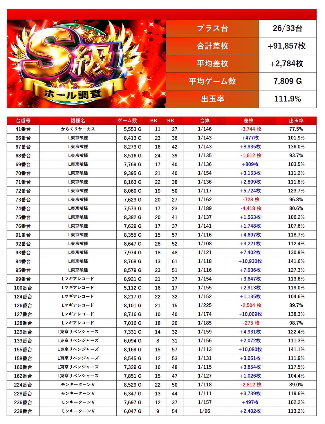 ・1台あたりの平均差枚数+2,143枚(平均出率109.5%)
