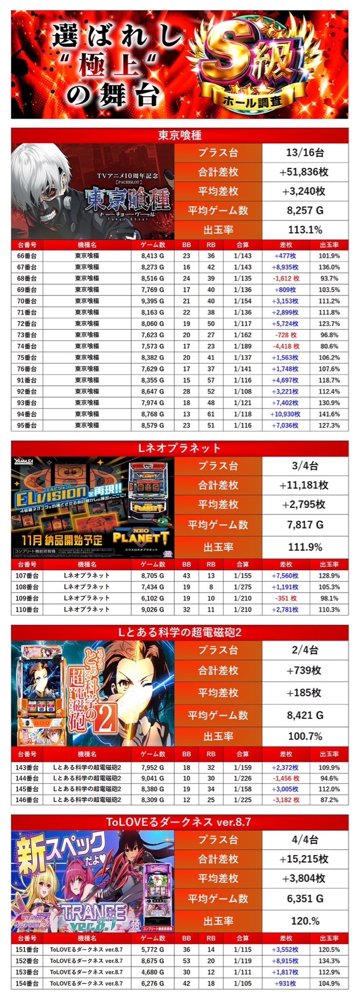 「東京喰種」や「Lネオプラネット」「Lとある科学の超電磁砲2」「ToLOVEるダークネス ver.8.7」の4機種28台がpickupされ平均差枚+2,820枚/出率111.8%だった。
