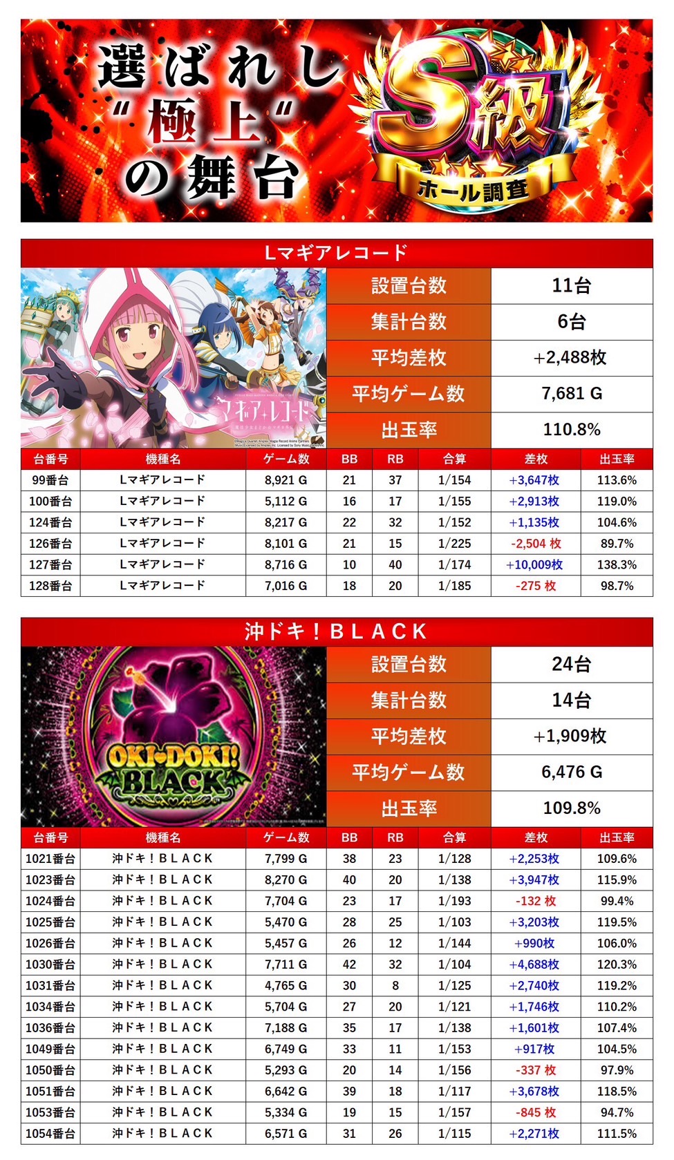 「マギレコ」はニブイチの仕掛けも確認され、平均差枚+2,784枚/出率111.9%と圧巻の出玉力を見せつけた。