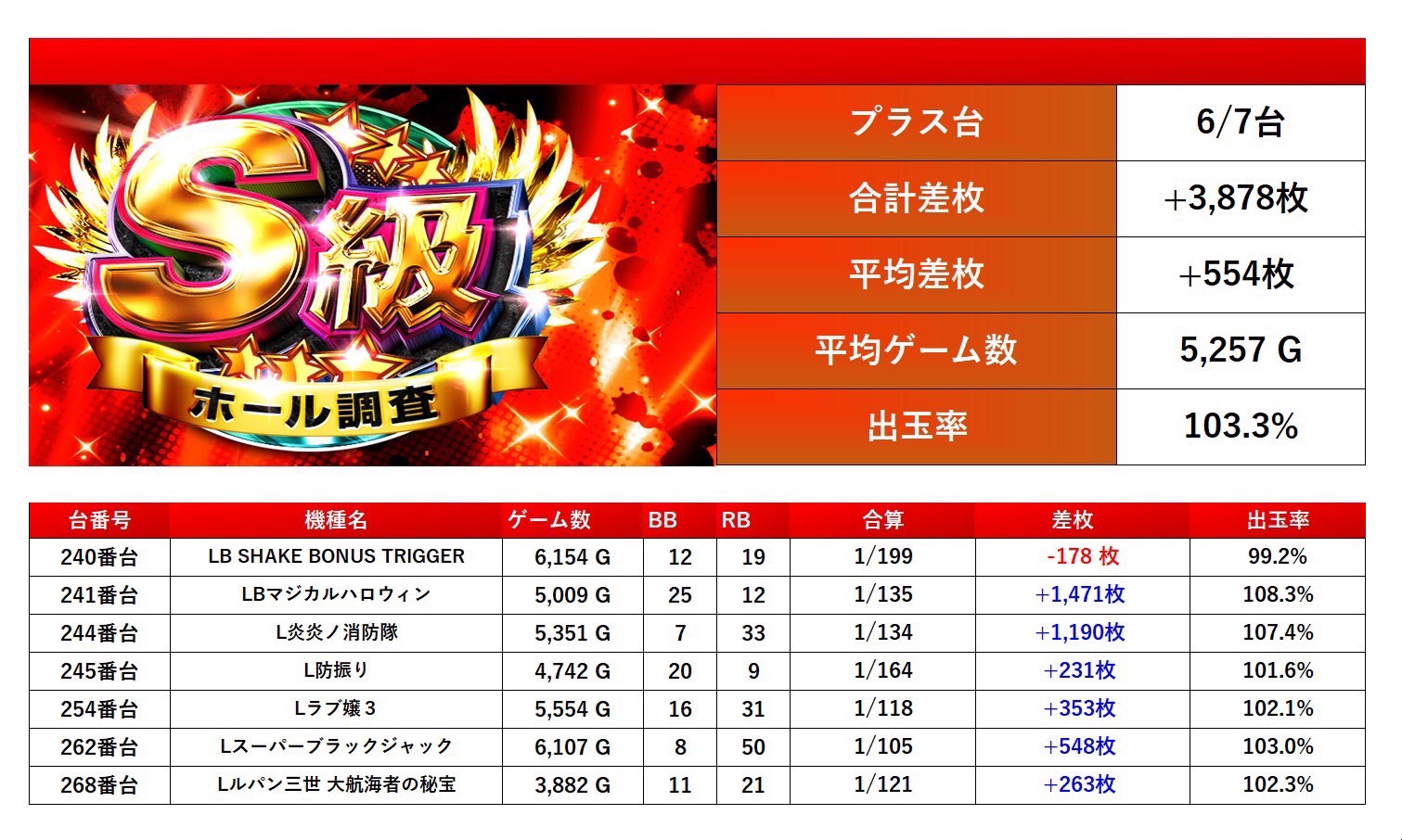 対象から7台優秀台を発見した。平均差枚+554枚/出率103.3%をマーク。多彩な機種がpick upされていた。