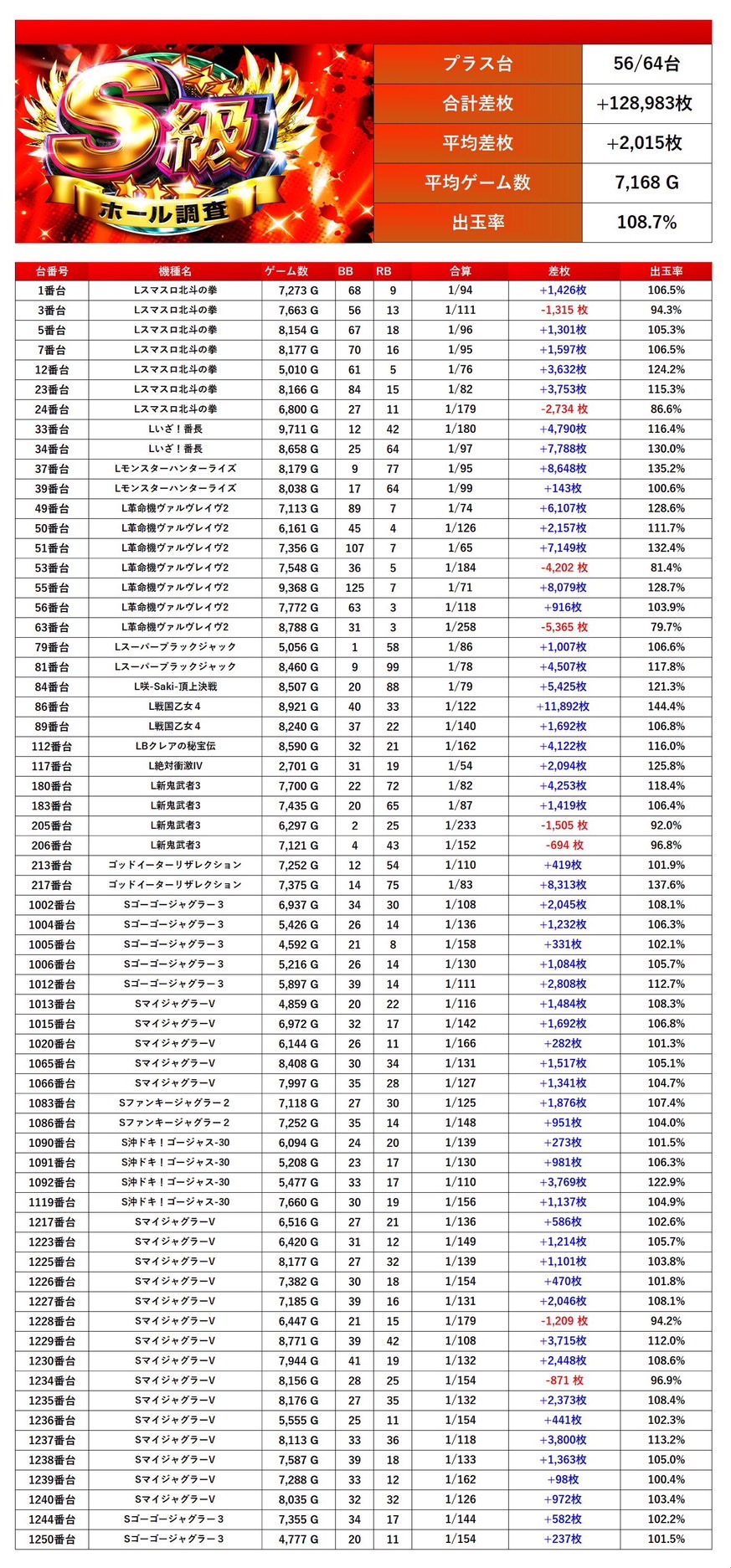 計64台と多台数がpickupされ、平均差枚+2,015枚/出率108.7%と高水準の数値を記録した。