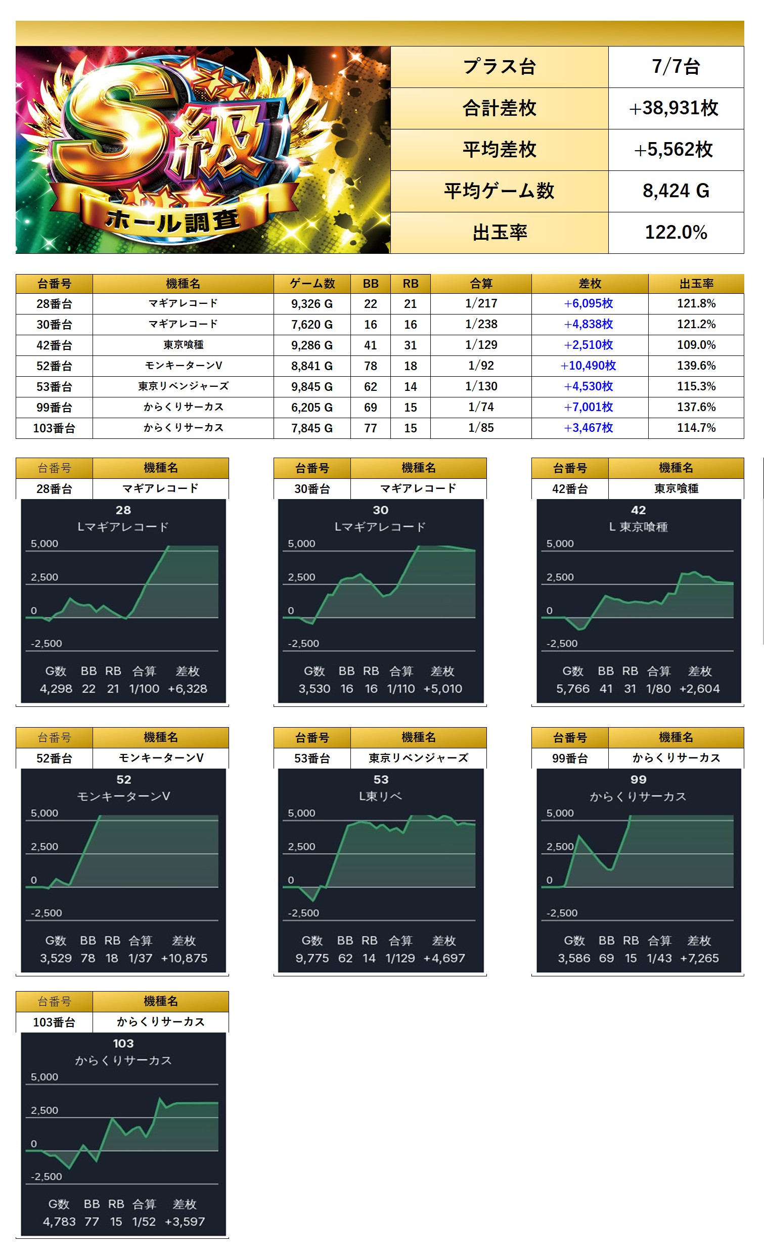 平均差枚は圧巻の+5,562枚、出率122.0%と114%を超える圧巻出率で魅了した。