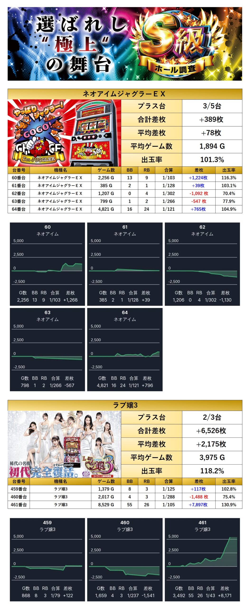 平均差枚+1,193枚、出率116.7%と出率は安定し、機種跨ぎの並びもも確認された。