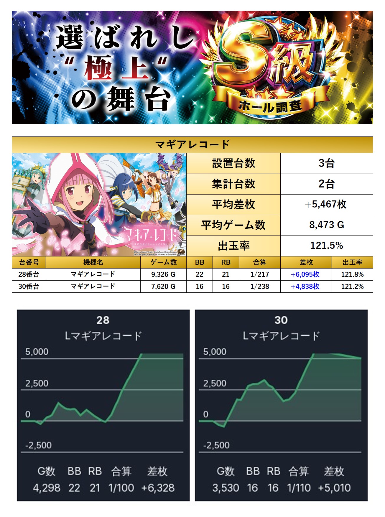 6回目開催となったBIGディッパー新橋2号店でのS級‐虹‐調査は、店内全体の18.4%がpick upとなった。総差枚+27,786枚/平均+151枚と稼働と質も高く、しっかり出玉もついていて今回の調査では文句なしの三つ星獲得となる。メイン機種を軸にニブイチ・並び仕掛けと圧巻出率で素晴らしかった。4台設置機種からも局所的に良好なデータが確認され、広範囲にチャンスが散りばめられていて、どんな抽選番号でも勝負ができる環境が用意されていた。偏りのない仕掛けというのも万人受けする秘訣だ。次回も連続三つ星に期待している。