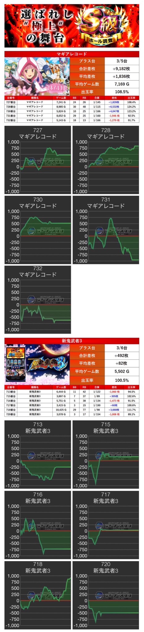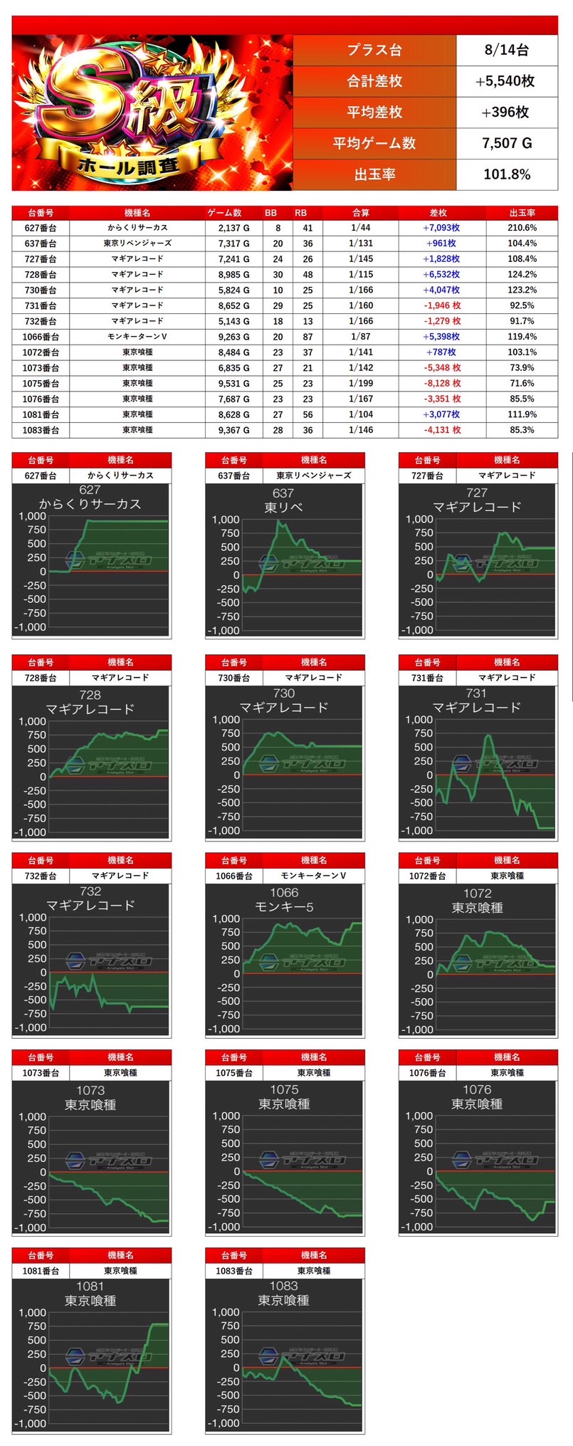 「東京リベンジャーズ」「マギレコ」「モンキーターン」「東京喰種」「からくりサーカス」14台をピックアップ。平均差枚+396枚、出率101.8%としっかり打ちこまれているが、伸ばし切れない台が多数あり控えめな結果となった。