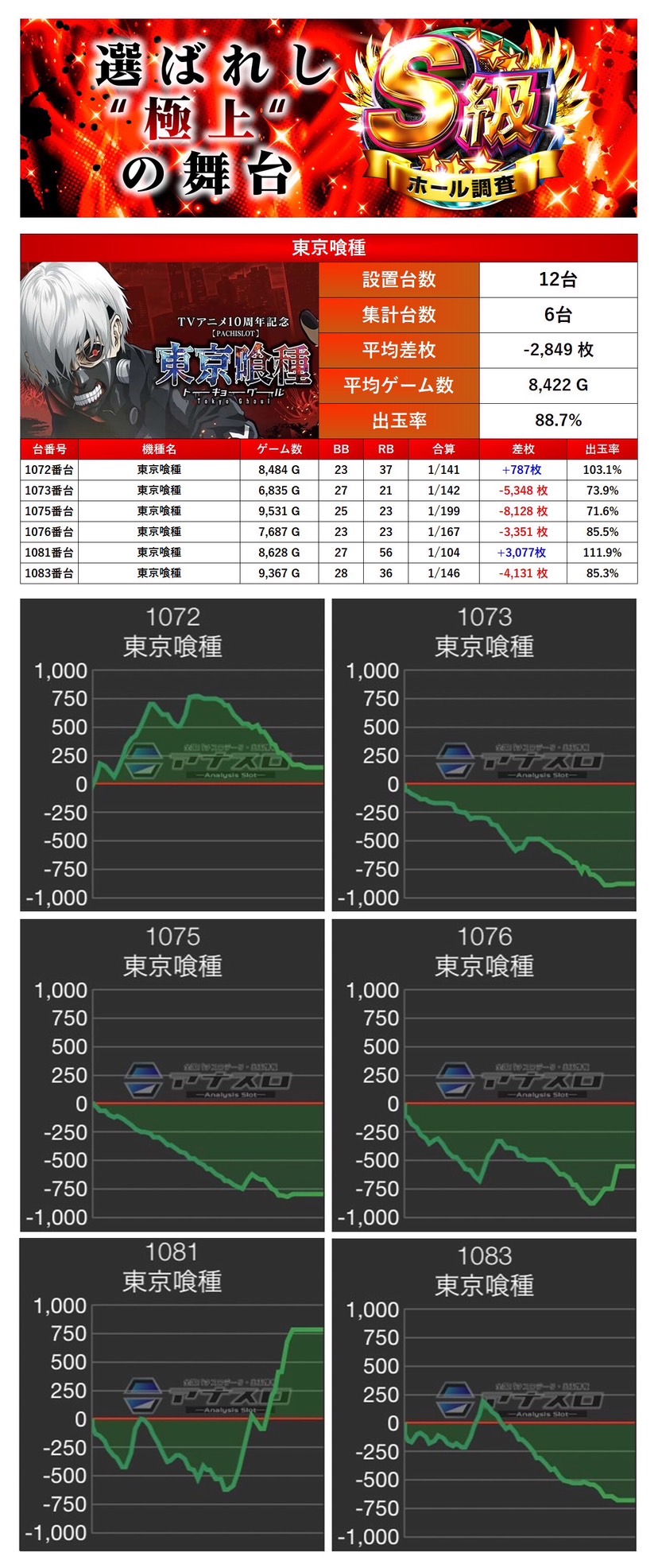 ニブイチは「東京喰種」の1機種6台がpick upされた。平均差枚−2,849枚、出率88.7%と惜しくも出玉が伴わなかったが、回転数からユーザーの期待は伺えた。